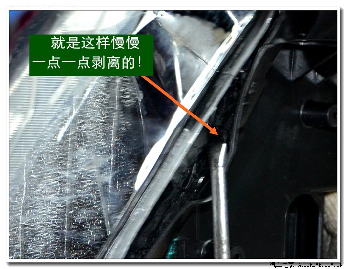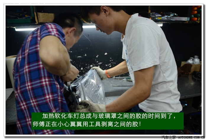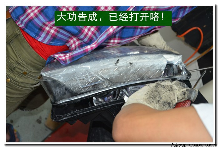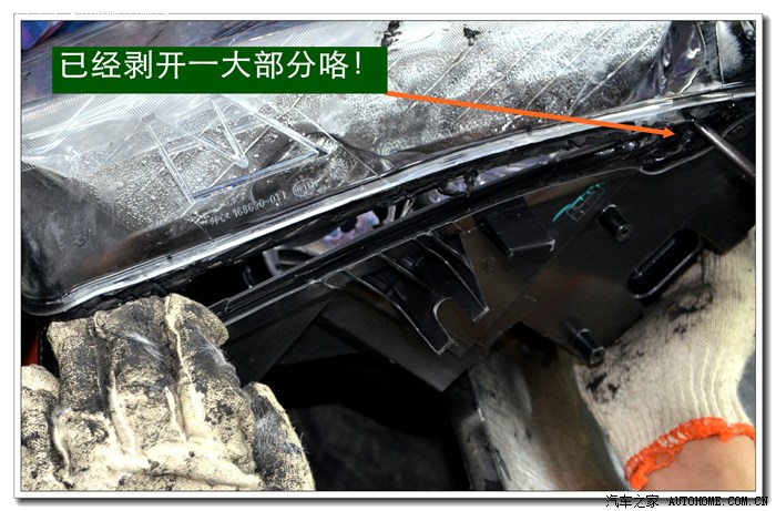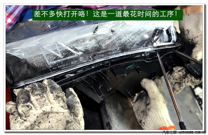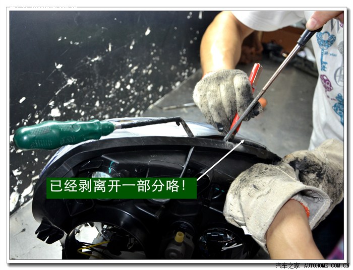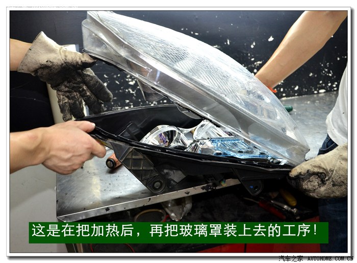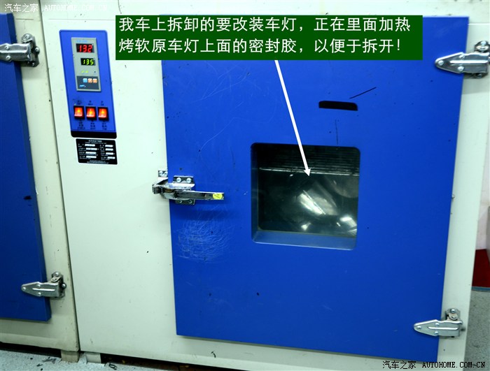 4、 逍客大灯是冷胶密封的,拆开前必须要放在数控恒温烤箱里加热。待加热到一定的温度后再使用专用工具将大灯面罩和大灯底座分离。这个过程一定要细心控制用力的力度和方法,否则容易损坏连接部位,造成以后密封不好,产生漏水等状况。