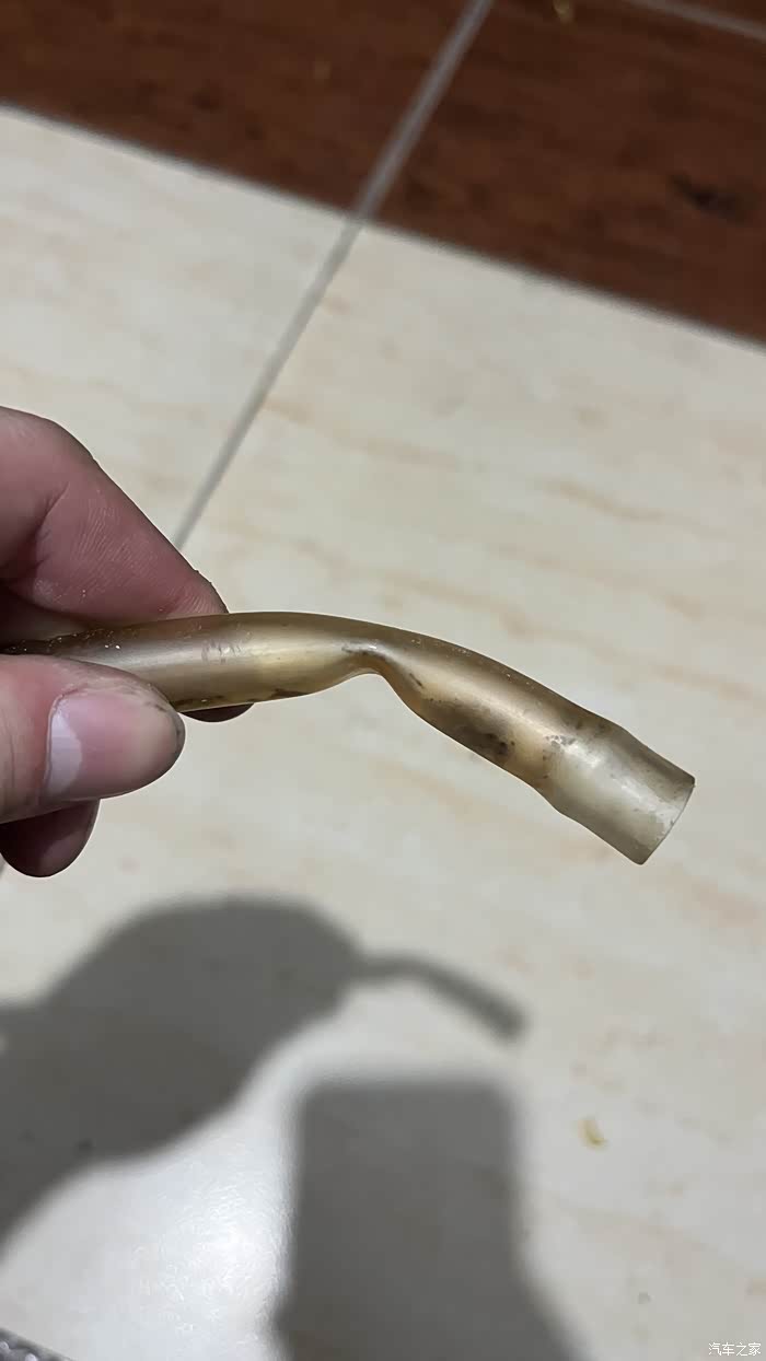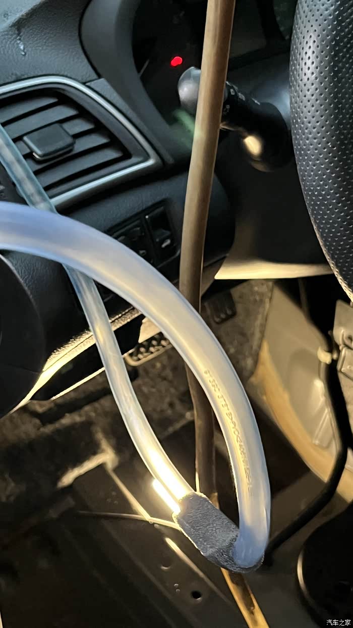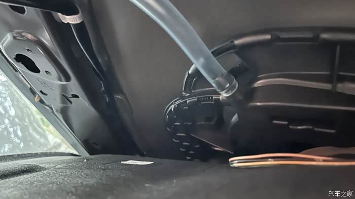 主驾侧:刷子捅到A柱下端卡住了!手从方向盘下面钻进去摸——排水管老化成直角,折住70%!