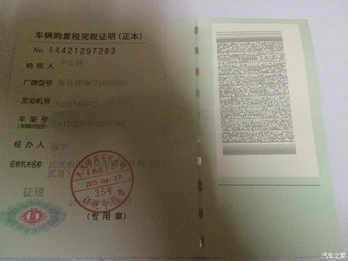 购置税正本,6500购置税。购置税是按照合格证上面二维码扫描的价格来收的。多坑了我300多