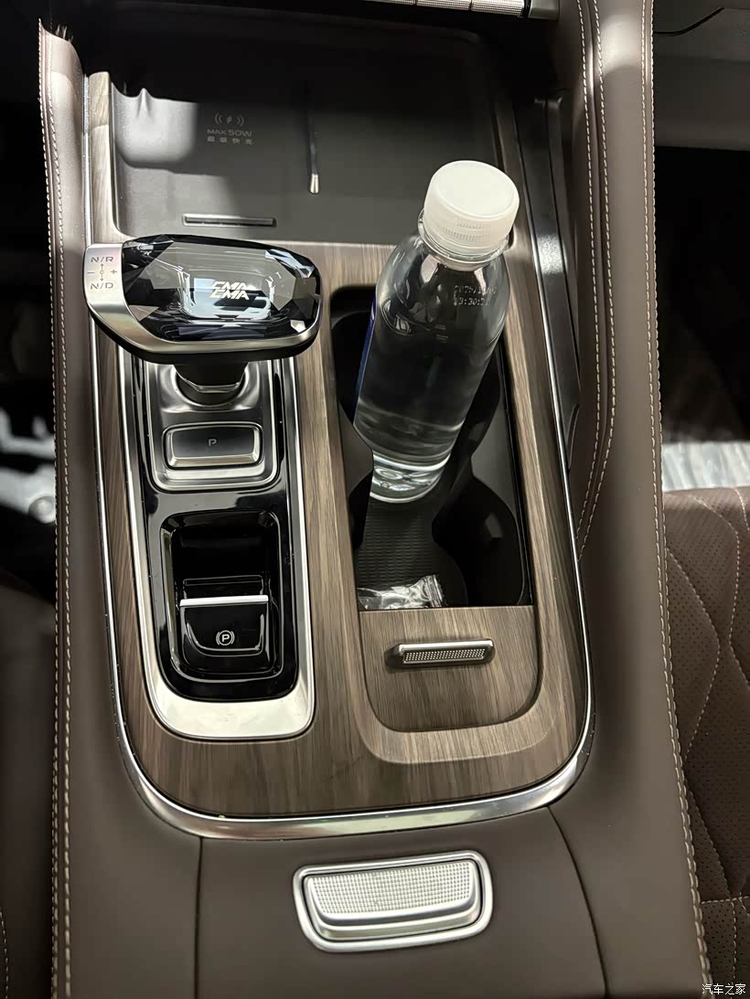 触控响应几乎零延迟,分屏操作时导航、音乐互不干扰,连座椅加热/通风都能在屏上一键调节。内饰的木纹饰板+皮质包裹,摸着手感高级感拉满,水晶挡把颜值在线,旁边的杯架放瓶水也不影响操作。