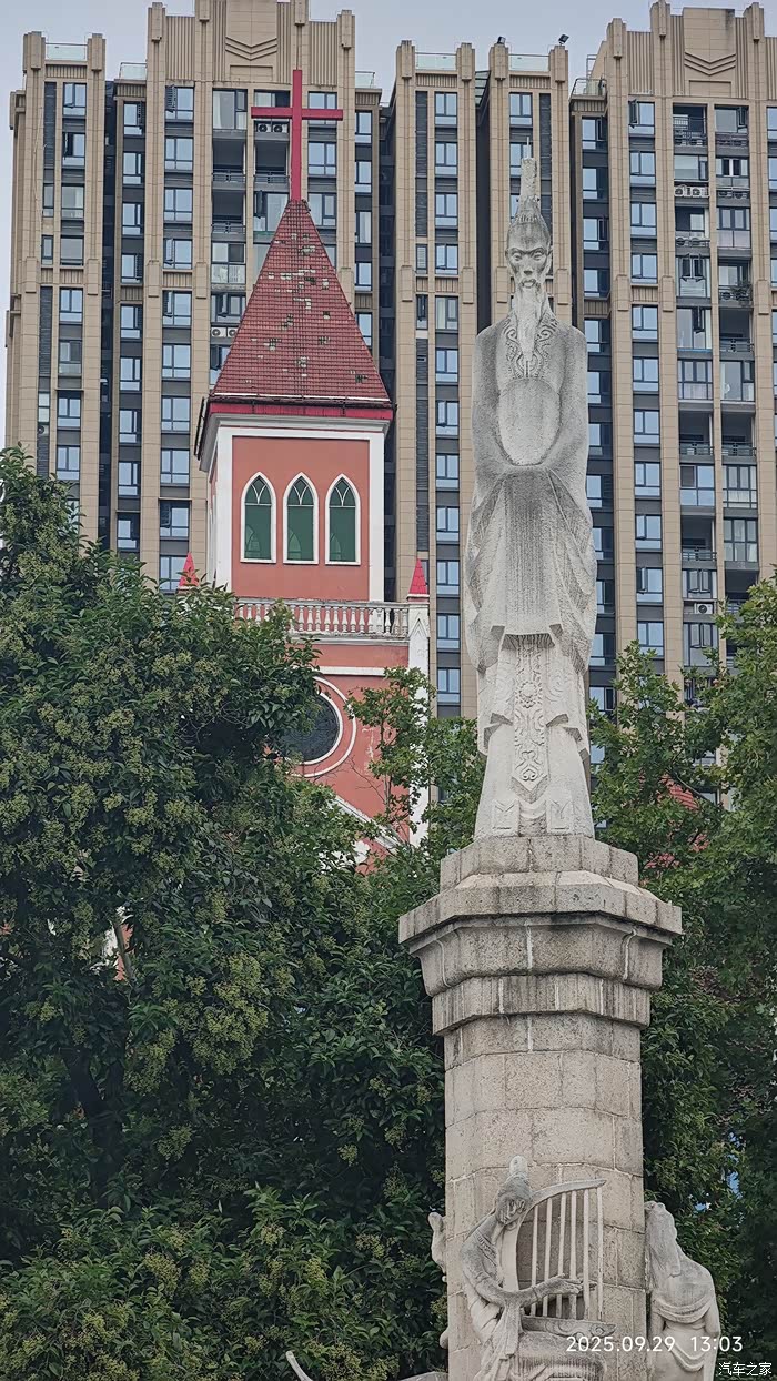 前面孔子雕塑,后面教堂。东西方的文化交融