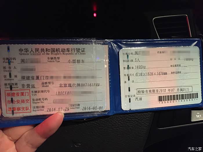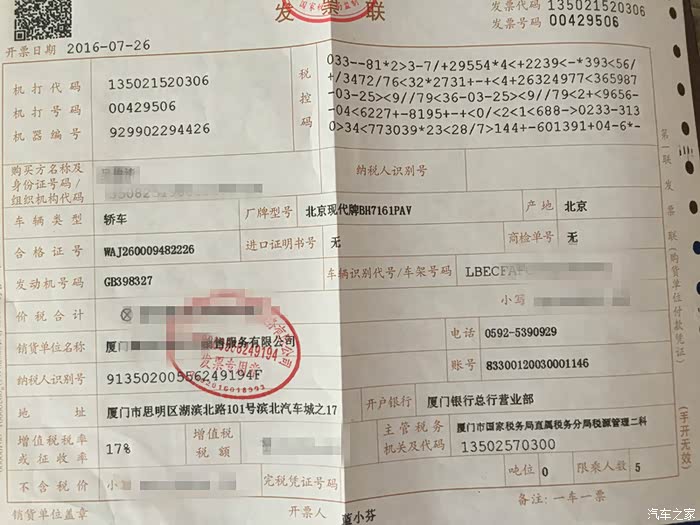 7日,自己一个人大清早坐着班车去了厦门,到店里时大概10店钟,店门口停着好多领动和名图,看来这两款车是北现的主力军了。进店后,找到了销售,跟我移交了车辆的基本资料,什么两把钥匙、发票、完税凭证和保险单等,由于是贷款所以登记证压在店里了。