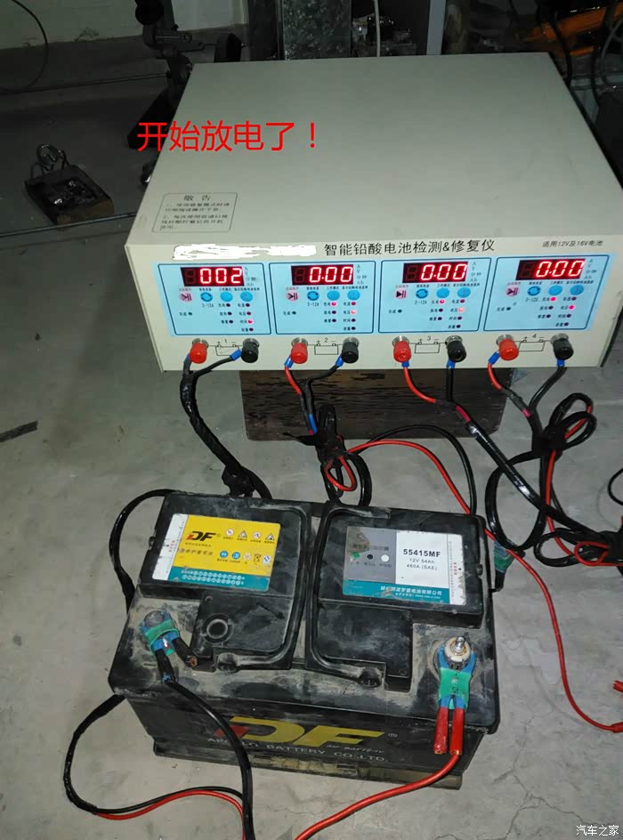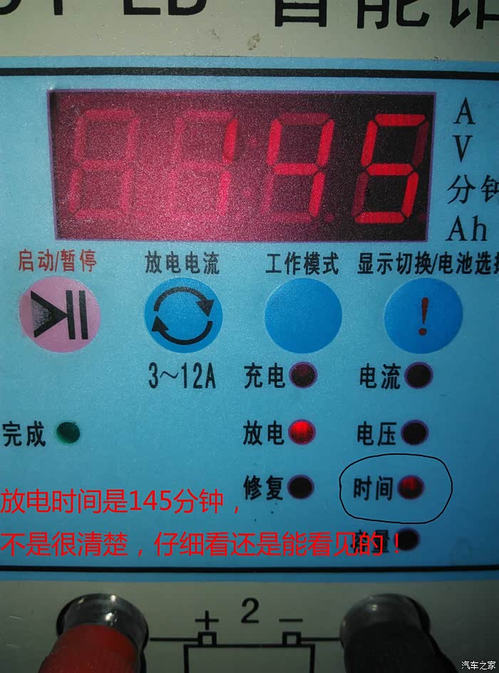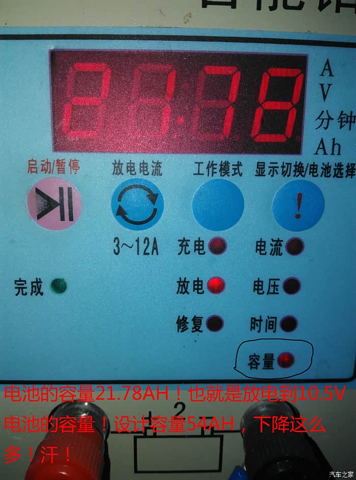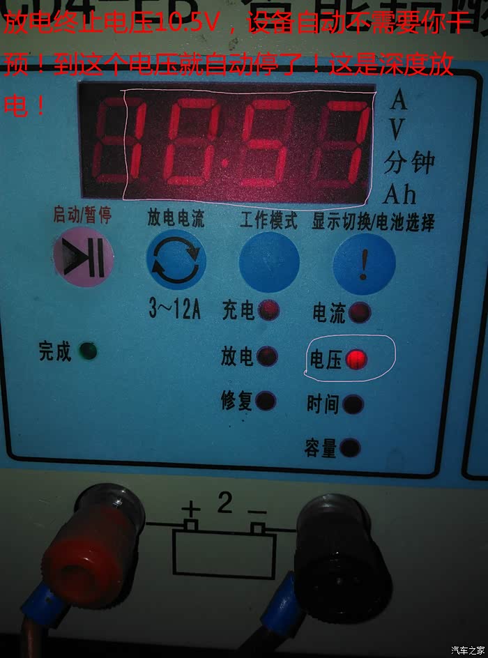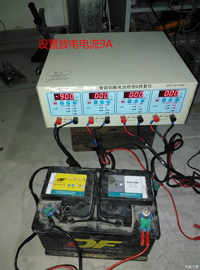 设置放电电流9A,个人的经验不要太大,不超过0.2c,也就是电池容量的0.2倍,这是54Ah的电池。没有这个设备的车友可以用2个12V 55W的灯泡代替(唯一不方便的就是要经常看着万用表,放到10.5v)。仪器就方便多了,你选择放电到10.5v就自动停止了。免得过放电!不同状况的电池放电电流不一样的,修这玩意全凭经验。