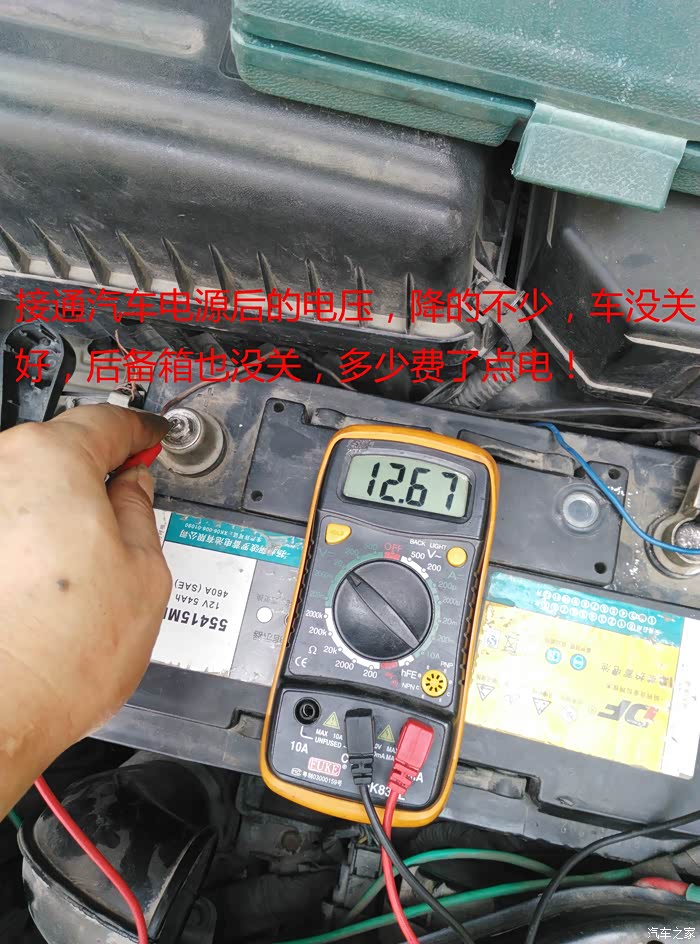 接通车的电源,看看电压,我靠降的不少呀12.67V,不过后备箱灯亮着的,门没关好两边转向灯要闪了好多下。