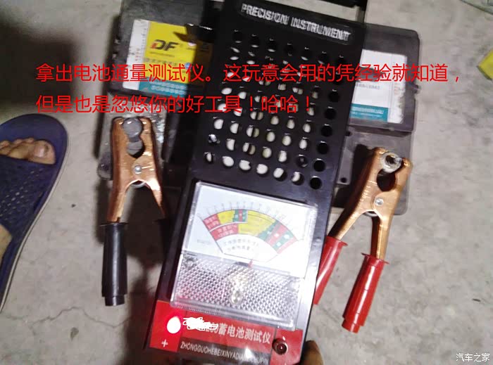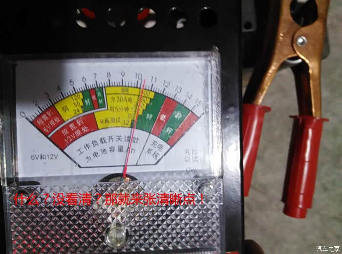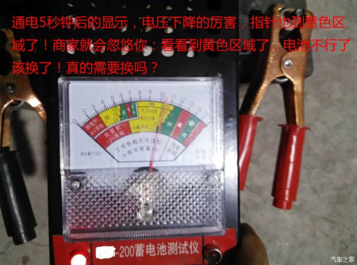 仪器下面有个钮子开关,接通5秒后(不要超10秒),指针显示在黄色区域,那么在黄色区域到底是好还是坏,这个不能一概而论,但JS一定会告诉你电瓶不行了,该换新的了。凭经验我觉得这个电池还有点修的价值,当时心里确实没底,毕竟7年了呀。