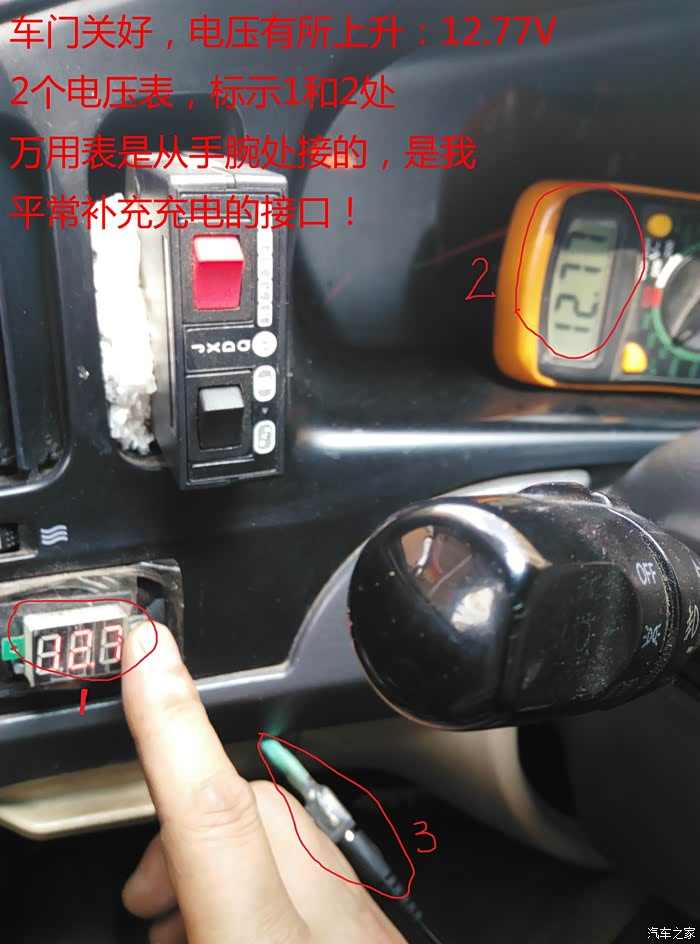 车门关好,到驾驶室再测量一下,电压恢复了0.1V。2个表显示的!