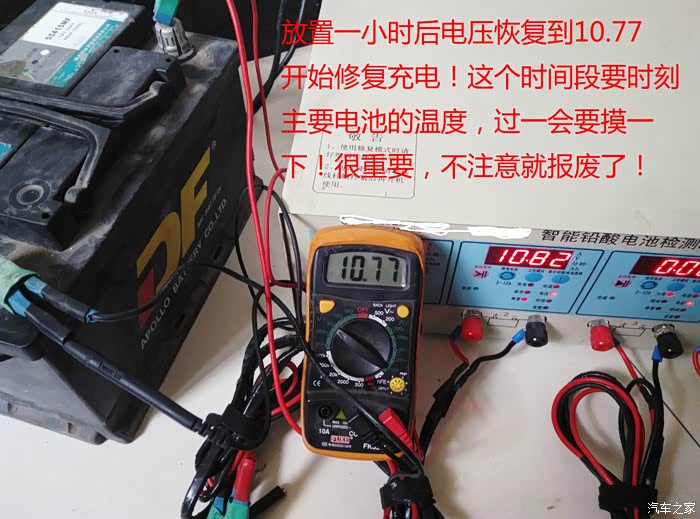 放置一小时后的电压10.77V恢复比较慢,放置时间差不多了。要开始修复充电。