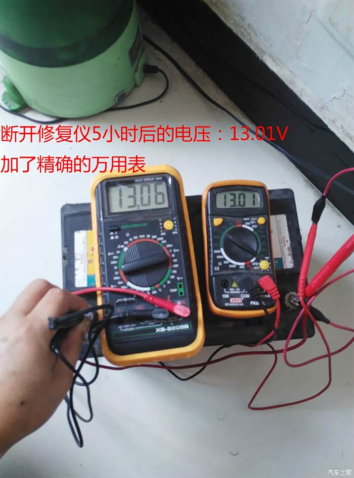 关闭修复仪后电池的电压!13.3V,别惊奇刚断开,充满了不等于不充还是有小涓流的!!所以才那么高的电压!