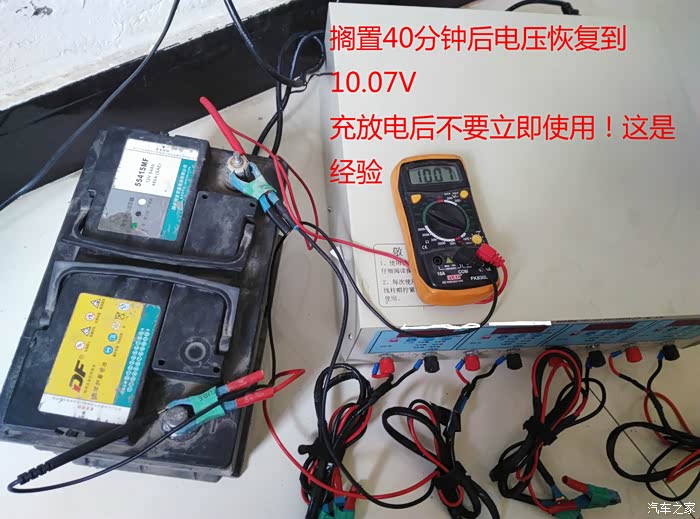 七、如果你不急就放一晚上,再测量电压,如果比刚从车拿下来第一次电压对比,电压提高0.6V以上,那么恭喜 你,电池还可以为你服务。如果你不满意就得要进行深度放电(这个我不建议)我一般第一次加蒸馏水,