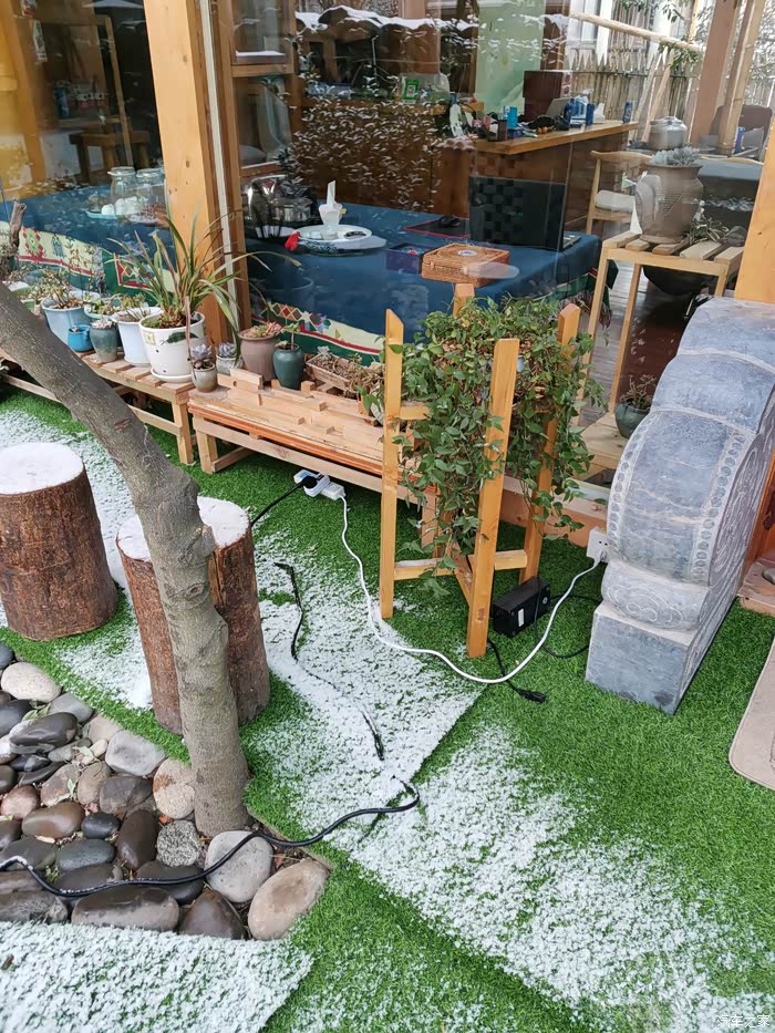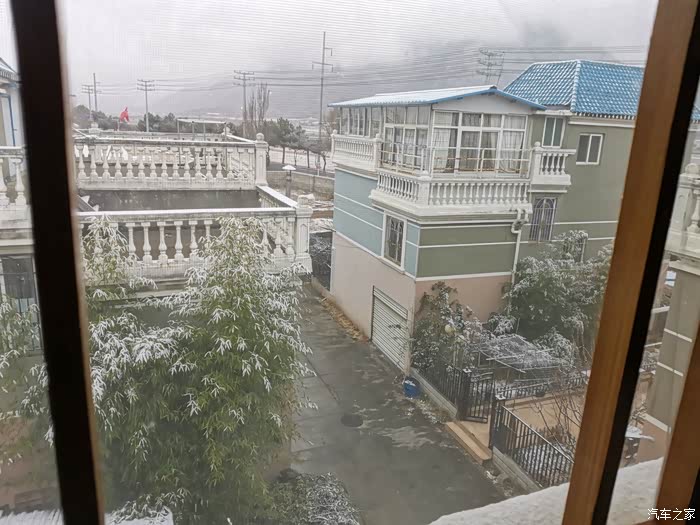 其实从房间里往外看,下雪量还是特别小的,看出去只是飘了那么一点点,不是很多。
