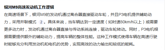 网上、宣传和使用手册里表述:银河M9高速发动机工作逻辑在高速场景下,银河M9的发动机通过离合器直接驱动车轮,并且P3电机提供辅助动力,采用并联模式2。具体来说,当车辆达到一定速度(如时速80km/h以上)或需要更多动力时,发动机通过离合器直接与传动系统连接,驱动车轮转动。同时,P3电机根据需要提供额外的辅助动力,提高车辆的整体性能。这种工作模式使得车辆在高速行驶时能够充分利用发动机和电机的优势,实现高效的动力输出和较低的能耗。