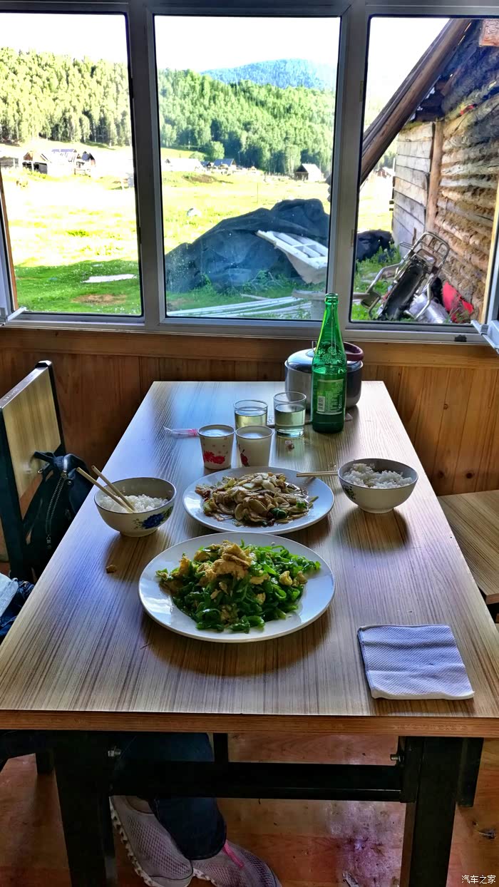 到达禾木是中午1点左右,两个人随便点了两个菜,问老板有没有啤酒,老板说就在边上自己拿,虽然是6月常温的啤酒也很凉,吃完就走不用结账,老板会给你记上,难道不怕挨宰吗?告诉你在新疆不会,这顿饭老板算了我68元,天哪这是在景区内哦,太便宜了。