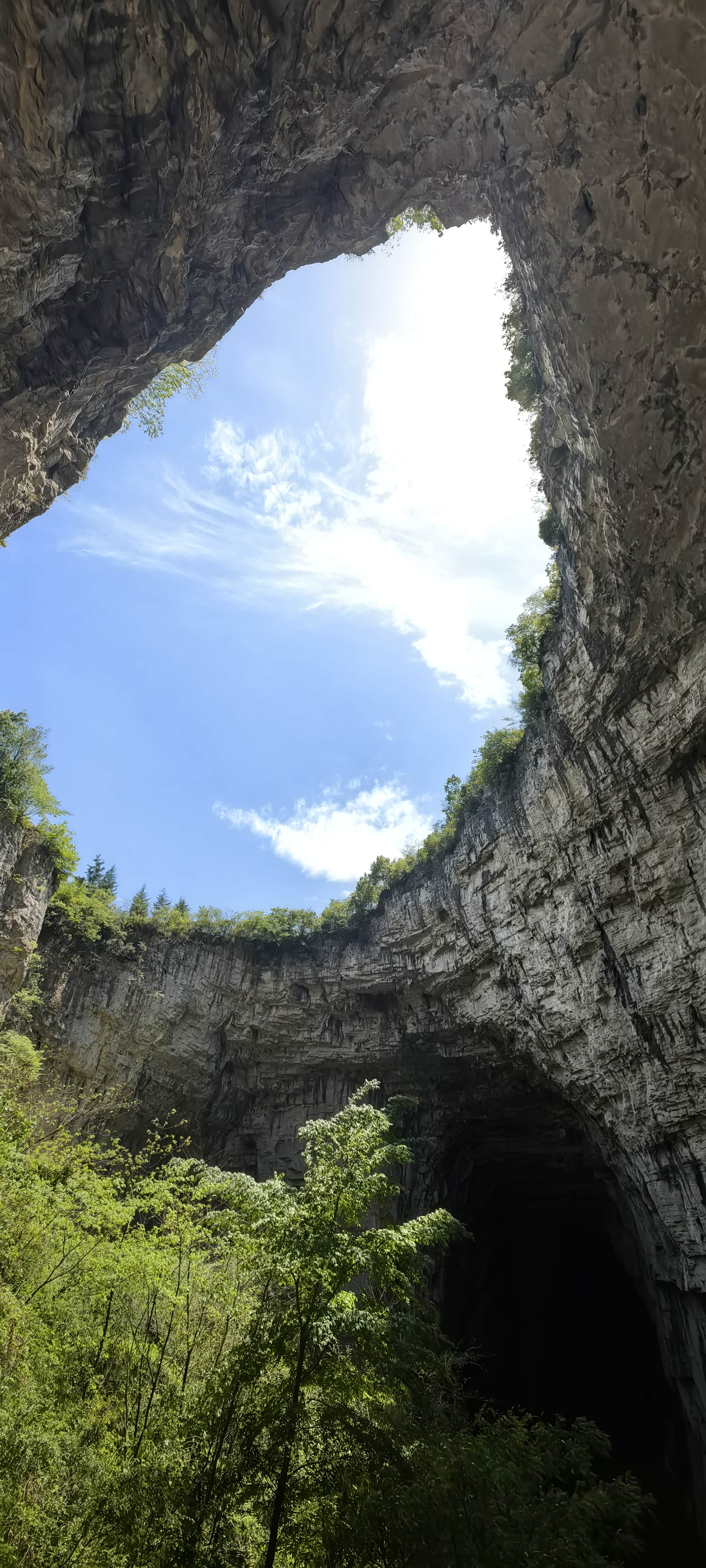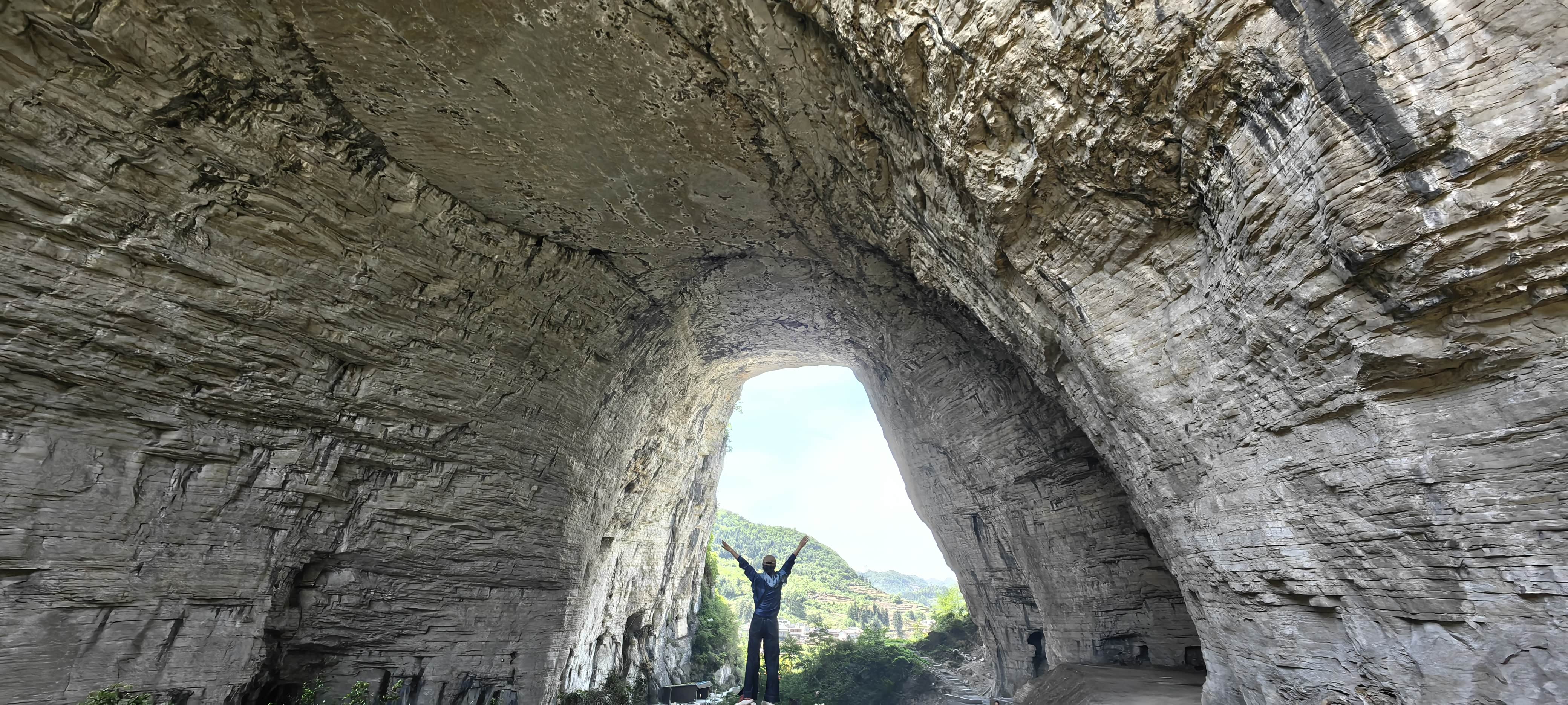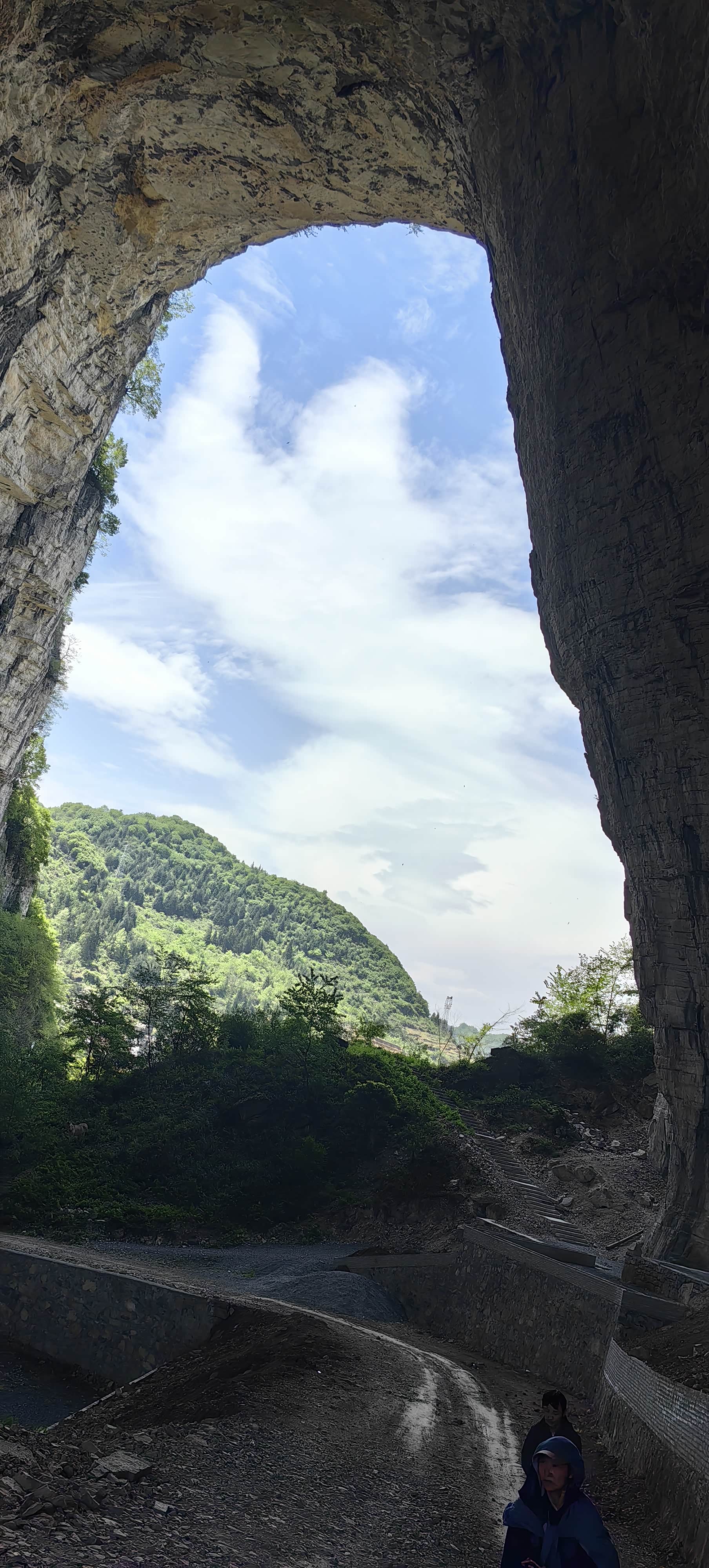 午餐在大方县城解决,这里我们也曾经来过,大方县城最具特色的景点应该是城市梯田,因为曾经欣赏过,所以,下一站选择了另一个免费景点——清虚洞。大方清虚洞原名穿洞,距县城10公里,清虚洞是一座山体巨大的溶洞,由天生桥、天窗洞、溶洞组成喀斯特景观。该洞桥高178.25米,跨高105.25米,拱桥跨度最大处127.35米,最小处77.69米,桥身长400米,宽200米,据称其规模已超过世界吉尼斯记录的美国犹他州天生桥。距离清虚洞很远就看到其宏伟的山洞横跨期间,我们在停车场停车步行前往,其实,可以直接开车进入洞内停车,当我们发现时也赖得再回去开车。进入洞中后瞬间感到人的渺小,我们顺着洞内的一个斜坡上去,里面还大洞套着小洞,上到最高处,仰视看到洞中的天窗,俯视看到洞内停的私家车似小贝壳,仰天长叹,直至苍穹,气势拉满。游览完后走出清虚洞,才仔细欣赏洞口外的景色,这里更是别有洞天,一座安静的小村庄,周边被山峦与池塘包围,仿佛进入陶渊明笔下的桃花源。