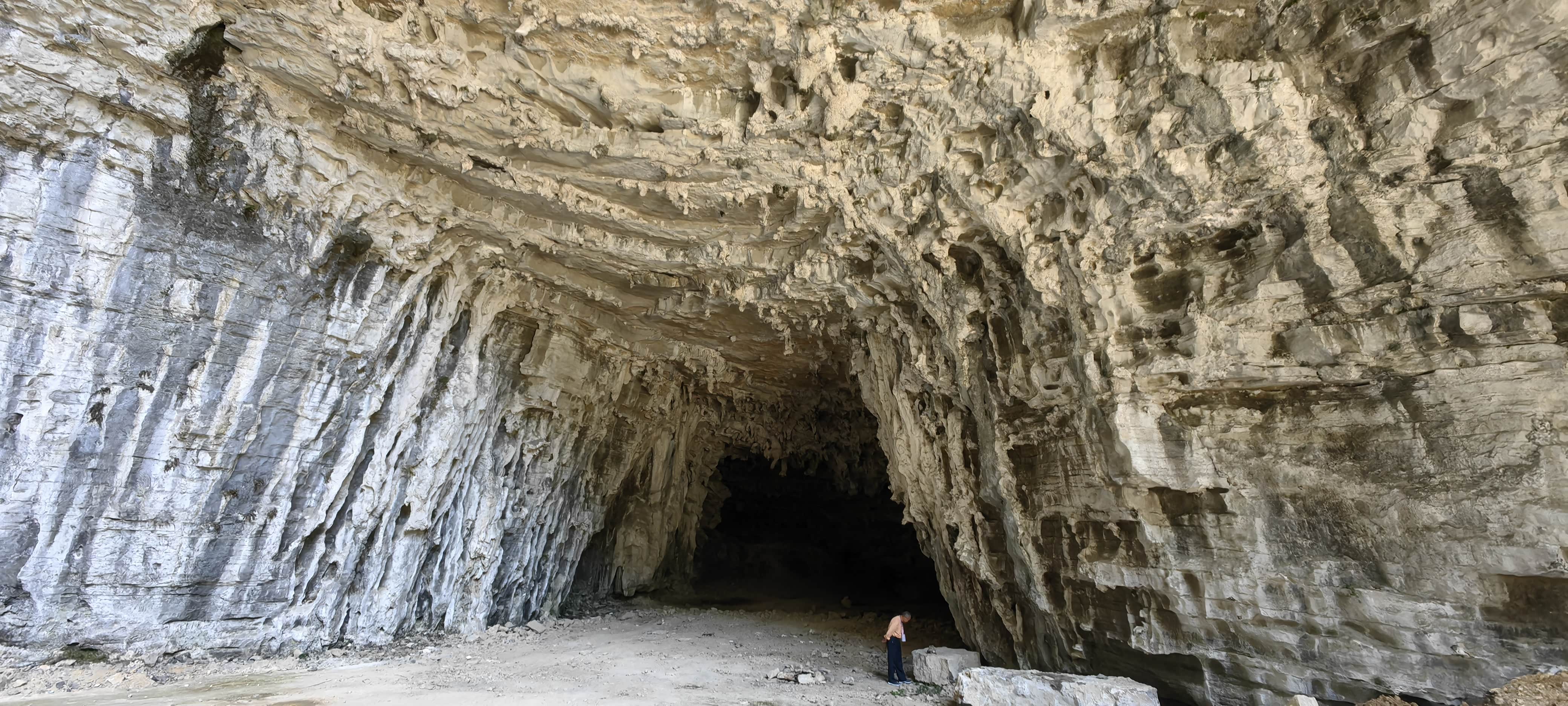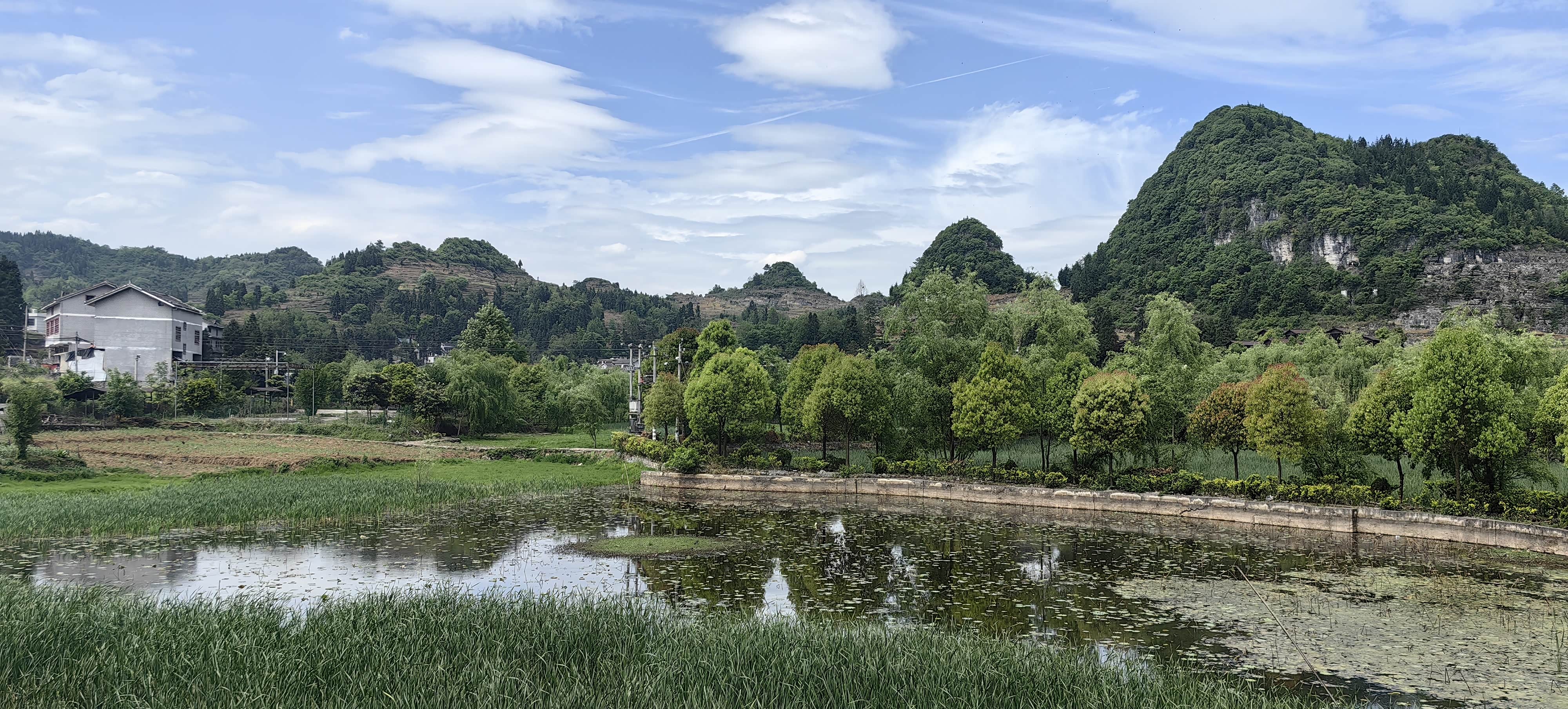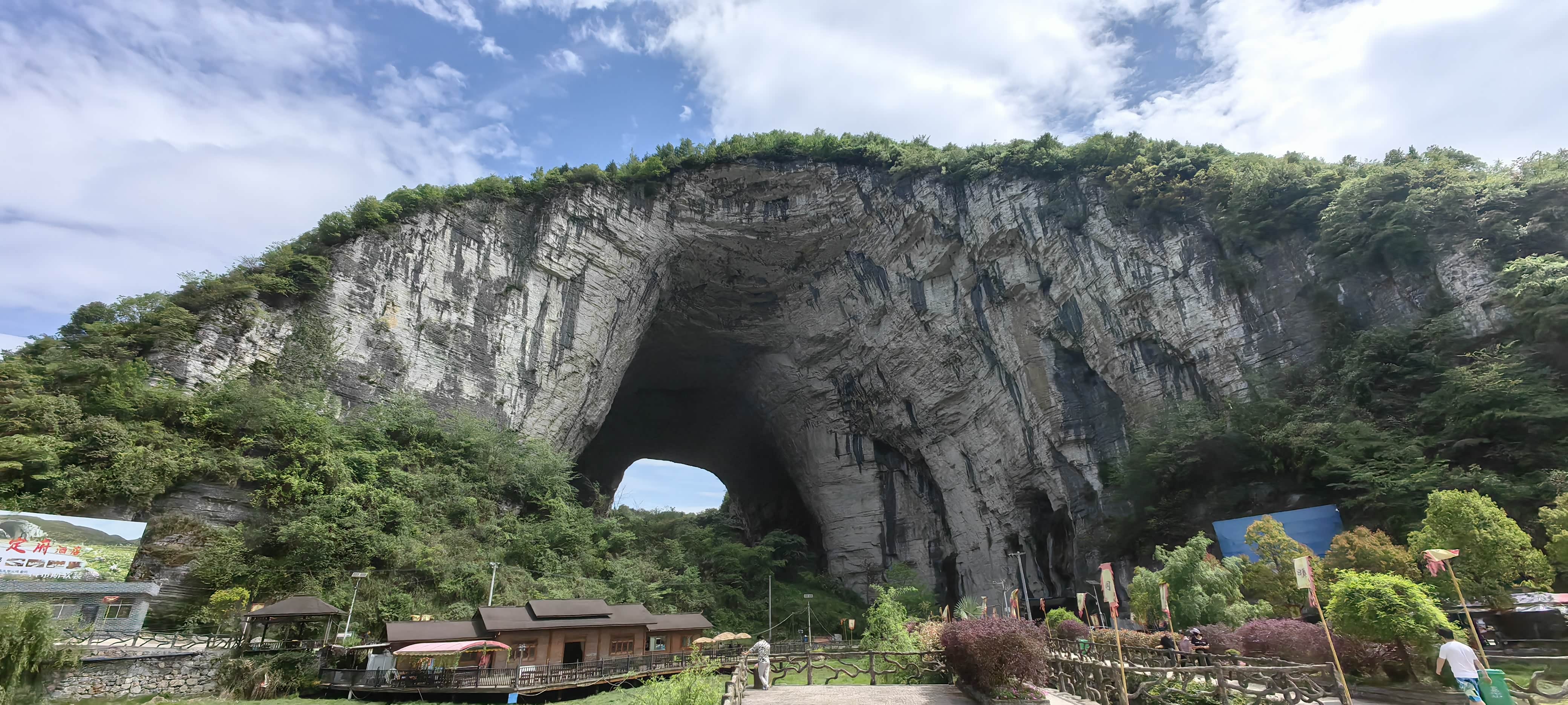 午餐在大方县城解决,这里我们也曾经来过,大方县城最具特色的景点应该是城市梯田,因为曾经欣赏过,所以,下一站选择了另一个免费景点——清虚洞。大方清虚洞原名穿洞,距县城10公里,清虚洞是一座山体巨大的溶洞,由天生桥、天窗洞、溶洞组成喀斯特景观。该洞桥高178.25米,跨高105.25米,拱桥跨度最大处127.35米,最小处77.69米,桥身长400米,宽200米,据称其规模已超过世界吉尼斯记录的美国犹他州天生桥。距离清虚洞很远就看到其宏伟的山洞横跨期间,我们在停车场停车步行前往,其实,可以直接开车进入洞内停车,当我们发现时也赖得再回去开车。进入洞中后瞬间感到人的渺小,我们顺着洞内的一个斜坡上去,里面还大洞套着小洞,上到最高处,仰视看到洞中的天窗,俯视看到洞内停的私家车似小贝壳,仰天长叹,直至苍穹,气势拉满。游览完后走出清虚洞,才仔细欣赏洞口外的景色,这里更是别有洞天,一座安静的小村庄,周边被山峦与池塘包围,仿佛进入陶渊明笔下的桃花源。