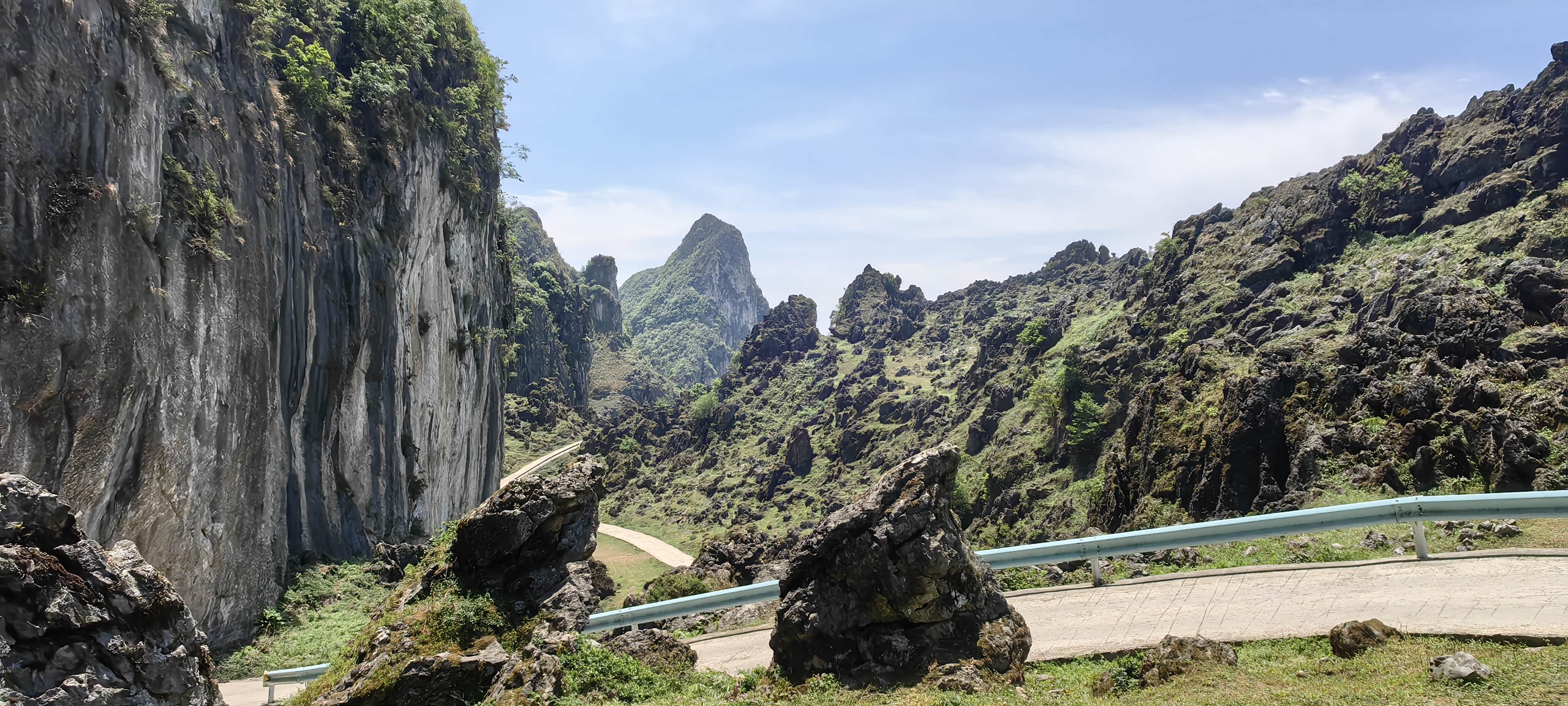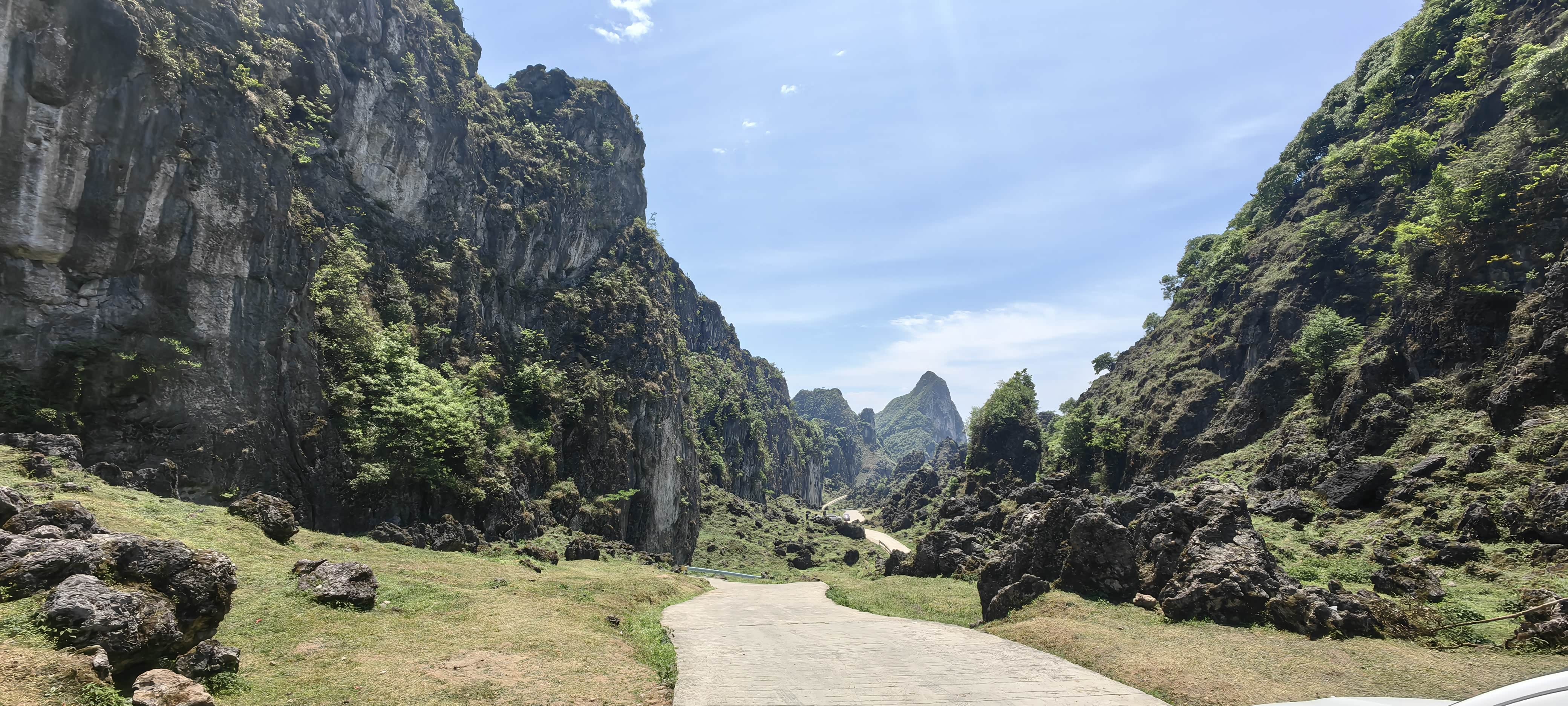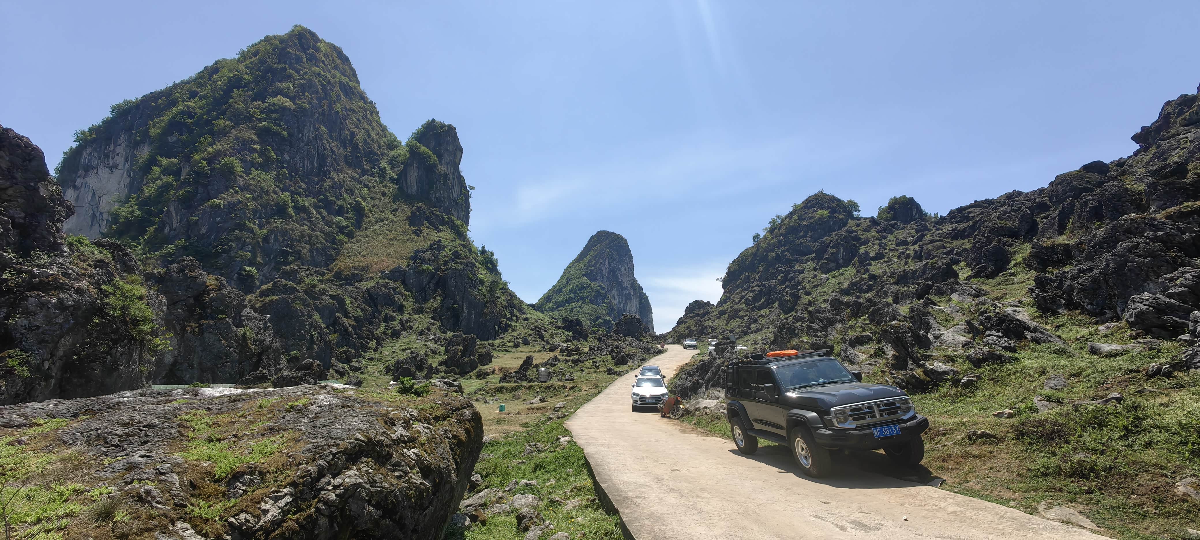 我们稍事停留就前往下一个目的地——龙脊山,高德导航直接输入“龙脊山景点”即可,途径道路狭窄,错车有一定难度,坡度大,自驾需要多加小心,途中我们曾遇到一辆房车,这么狭窄的道路不知道它是怎么上去?途中的景色很是一般,不过当我们即将到达目的地翻越一个垭口,映入我们眼帘的景色瞬间发生变化,一条水泥路横跨和穿越山脊,山顶公路两边布满石林石峰,附近还有大片牧马草场,以及开满鲜花的高山草甸。公路沿着山顶峰林左右绕折,时而盘山走S弯,时而出现个大陡坡,前路地形变化多样,在云雾之中走这条路,感觉如同行在“天路”之上,附近虽然是高海拔的山脊,地形却有高山草场和石林区域,景观颇为独特,人们仿佛进入游戏魔幻世纪重现的“龙脊山穿越”。不走回头路,开车继续前行,从另外一个出口下山。