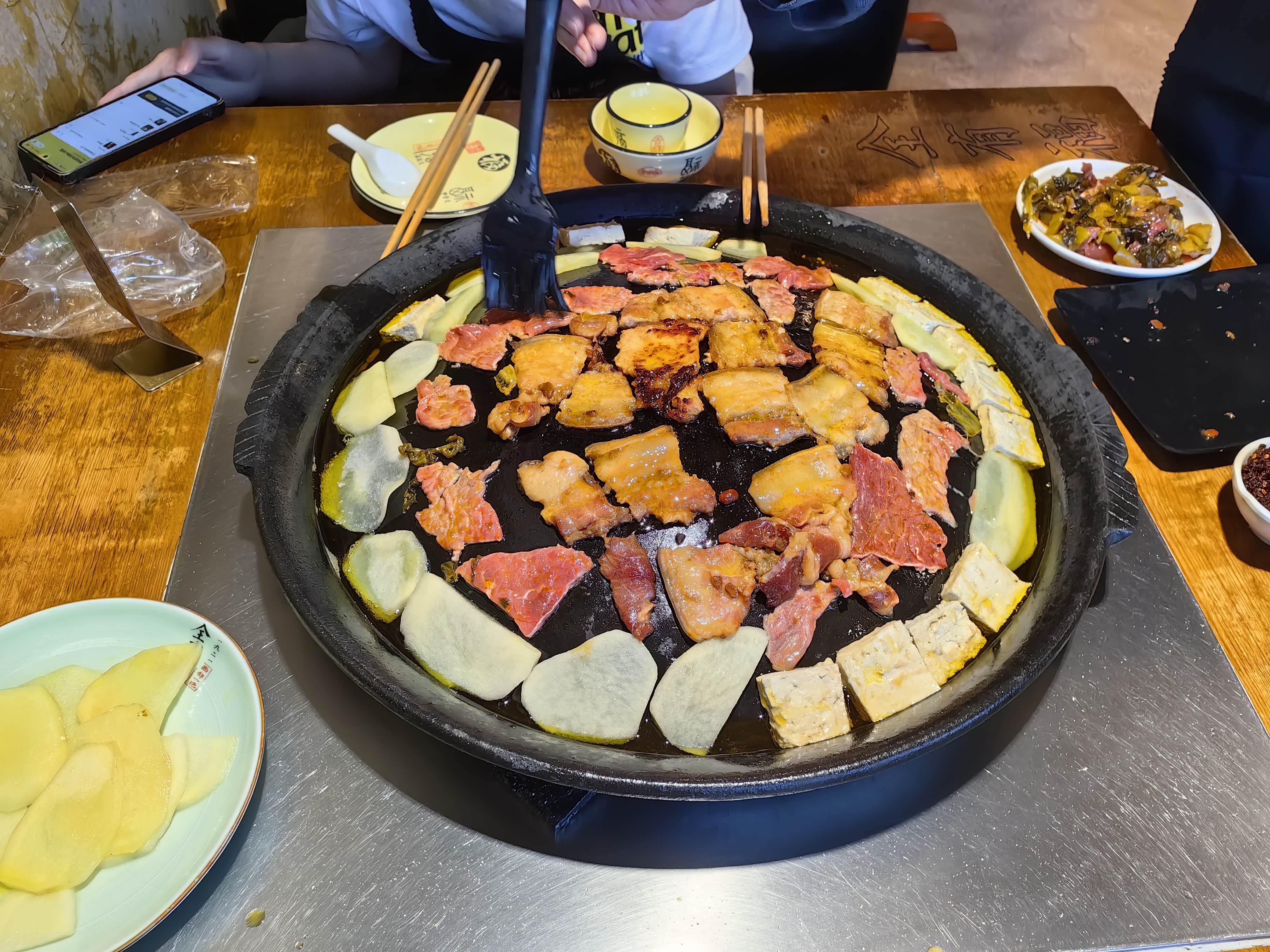 傍晚18:30分我们到达六盘水,入住“IU酒店(六盘水凉都里高铁站店)”。六盘水的特色美食是——烙锅,据当地人说最有名的餐馆是老字号“全有福”,这家餐馆的名字听着很土气,但是,餐馆的装修却让人眼前一亮,老板是个有品位之人,美食自然更棒,烙锅其实也就是自助烧烤的另外一种形式,只是其烧烤器具更加特别,味道还是挺棒。全天行驶:444公里,餐费238,住宿260元。