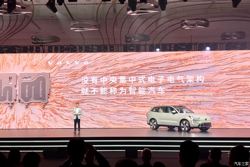 此次亮相的EX90有两款实车,七座版的EX90和四座版的EX90 EXCELLENCE,都是基于全新原生纯电平台SPA2打造的高性能纯电动中大型SUV。EX90采用中央集中式电子电气架构,通过中央计算平台和整车SOA软件架构,可以通过自主学习和整车OTA在线升级。