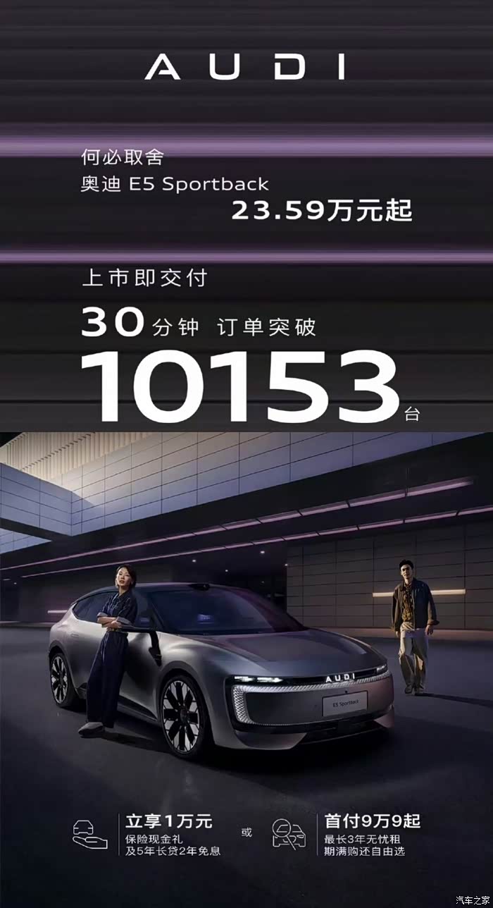 奥迪E5是奥迪新能源转型的重磅纯电车型,寄予着奥迪的厚望,因此发布给出了一个非常有诚意的价格23.59万起。发布后表现也是很不错,上市半个小时订单超过1万台。