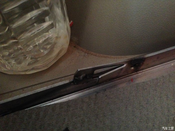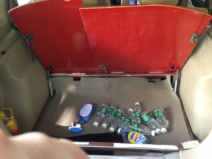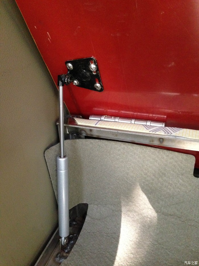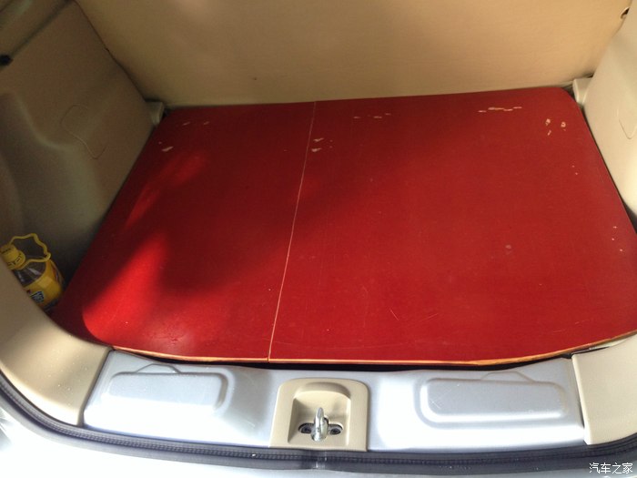 这个是开一边盖的,我是特意这样弄的,因为觉得如果整个盖翻起来要把上面的东西都搬下车才能拿到里面的东西,所以就设计了一边开大一边开小的两边木板,我的木板是坤电木哦,实料哦。。。。。(呵呵没不小心让你看到了我珍藏的玻璃水)。。