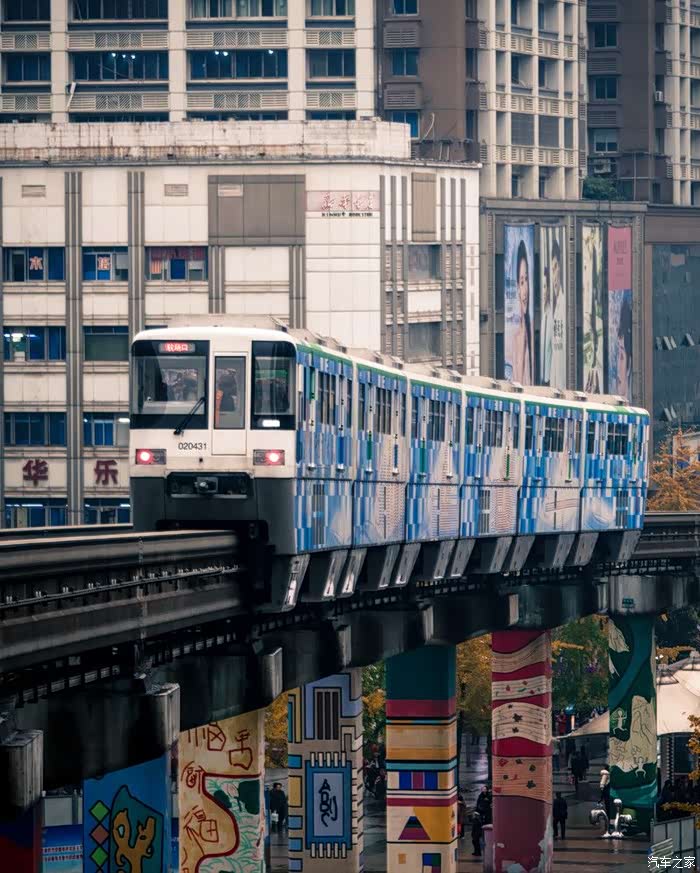 除却李子坝站,“杨家坪站”也是欣赏拍摄轻轨美照的好去处之一。在这里能拍到“跨座式单轨”与卡通柱的合影,恍然间亦让我有种走进漫画里的错觉。