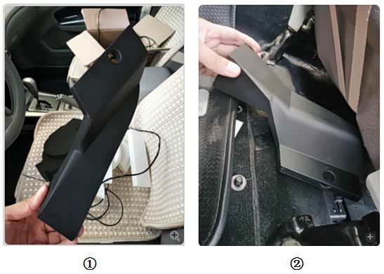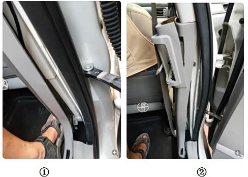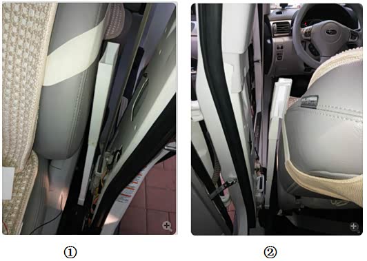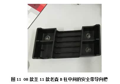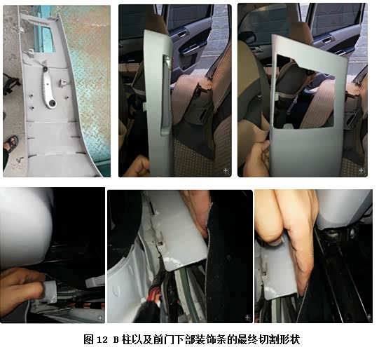 首先,要拆下小森的B柱内饰板,然后用刻刀按照以下形状切割B柱内饰板的上半部分,以及把中间的横向的加强筋一并切除,注意08-11款的老森B柱中部有个黑色的安全带导向槽(如图11),放心切除即可,对安全带伸缩无影响。因为12款的森林人,这个部件就没了。将B柱切成如下图12的形状,B柱下面,前门门框装饰板内侧,翻开黑色绒面,会看到一个白色的树脂压条,一样将延伸至B柱下方的部分一并切除,切的时候一定要用修理花草树木的剪子,尽量用刻刀割,实在只能用刻刀那也要从下往上挑着割,以免划破电路以及送油管。然后开始装车。