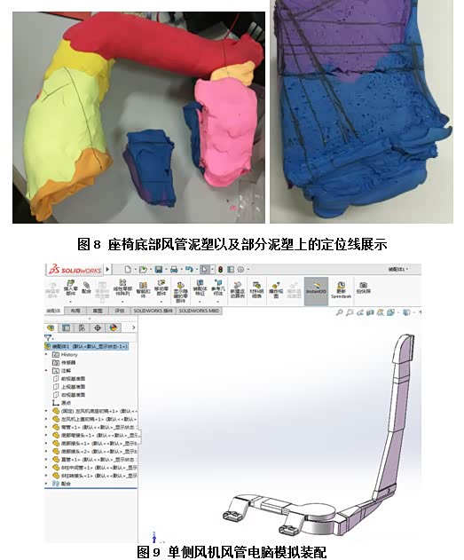 确定了风机,然后根据座椅以及B柱的内部空间来设计风管,风管不能太窄,否则空气流动阻力太大,不适合风机的发挥。也不能太厚,虽然厚了流动阻力小,但是在B柱内过厚的话会影响安全带的收放。而且还要考虑如何将风管放入座椅底部狭小的空间里,不仅要放进去还要留出伸手进去调整的空间。就这样风管在矛盾中设计着,为了能够安全配合,我先在座椅底部打泥塑,之后再优化泥塑,结合自己所学的流体力学知识,确定出了风管尺寸数据。之后,再进行机械制图。同时,为了保证风管内风量尽可能大而且安静,我尽量希望风管里的冷气以牛顿流体状态来运行,很少出现紊流状态。本着这几个原则,我设计出了以下风管。同样根据泥塑的测量数据,用solidwork2016画出了风管的模型,并在电脑上模拟装配出来,视觉效果还不错。(如图8、图9)