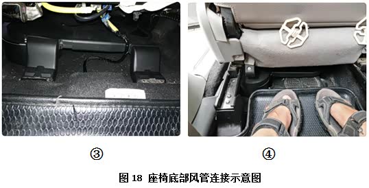 第六步,安装座椅底部风管和固定风机,以及连接车载ACC电源线。这个比较简单,根据风管形状插接起来就行,需要注意的是安装座椅风管前,第一要先将座椅调节的坐垫最高和最靠后的位置;第二要将风机放入座椅底部与B柱弯接头相连,然后在安装出风口连接头和底部弯管。此处空间比较小,但是原车的底部风口可以适当的里外活动。因此,能够顺利安装上所有风管,电路连接很简单和汽车行车记录仪一样的,正极接车载ACC并串联2A电阻丝,负极搭铁。小森车内保险盒正好有3个ACC电源接口,一个接行车记录仪,剩下的两个一边一个串联2A电阻丝再接风机。安装过程如图18所示,终于大功告成!!
