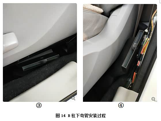 第二步,将汽车前排座椅调到最靠前,坐垫调到最高如上图13所示,然后将B柱下弯管从座椅前端沿着座椅底部塞到B柱位置如图14所示