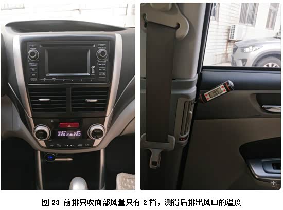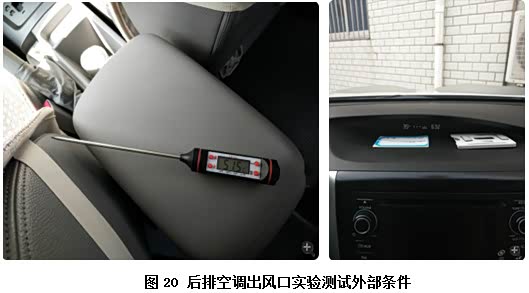 最后,将前排出风口调节到2档只吹前排,不吹脚面(这也是我常用的一种空调模式),此时后排的冷气只能靠风机抽吸主风管了,也是后排制冷最弱的时候,测得加装的后排出风口温度为19.9度,也能够满足大部分人的需求。(如图23所示)。
