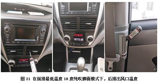 启动车辆,原地怠速,打开前排空调。之后,调节前排空调温度最低至18度。用温度计测得出风口的稳定制冷温度为9.9度。然后,调节空调为纯吹脚面模式,此时加装的后排出风口制冷能力为最强,测得后排加装的出风口温度为14.1度(如图21所示),并且还在下降,但是下降的很慢,我就不记录了。