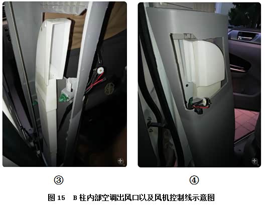 第三步,安装B柱风管,并将风机调节线沿着B柱拉伸到空调出风口的位置。如图15所示