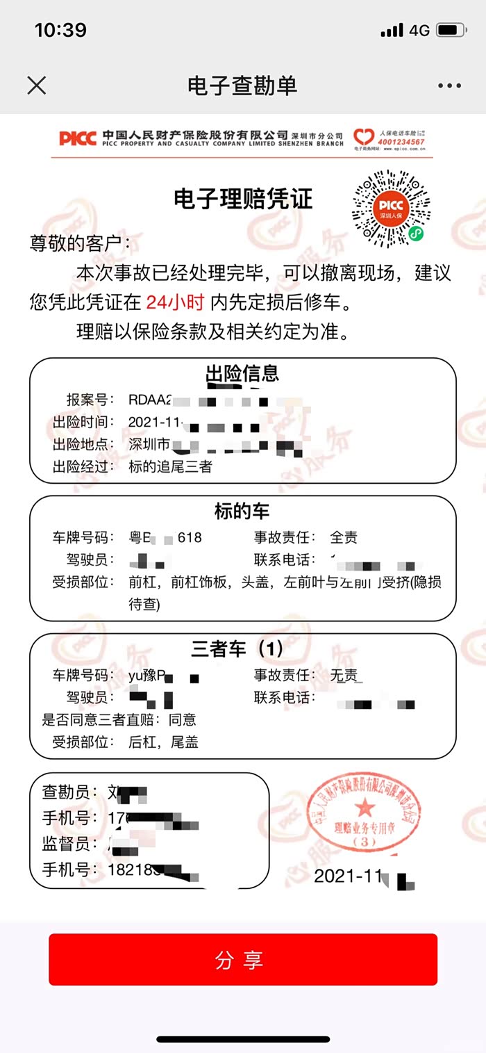然后再拨打报警电话(像我们这种责任清晰的小事故可以不用报警,直接由责任方报保险就可以了,这是现场来的交警铁骑告知的),再由事故责任方联系保险公司出险勘查(无伤亡情况,且责任清晰的,可以先联系保险公司)。
