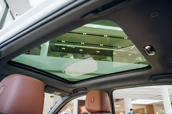 全景天窗从前排头枕顶部一直延伸到第二排头枕顶部,尺寸挺大的。