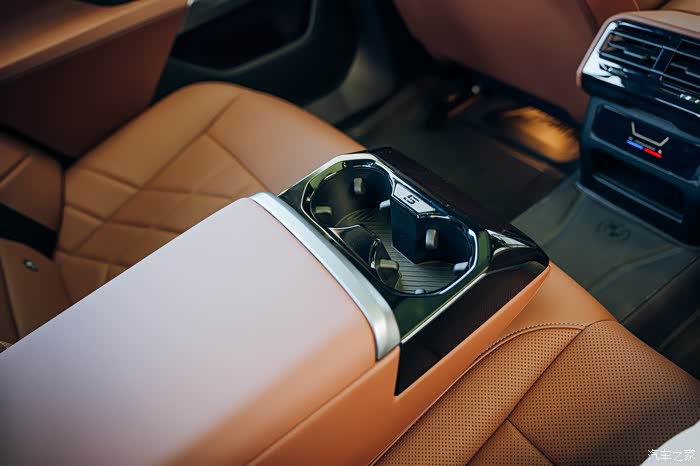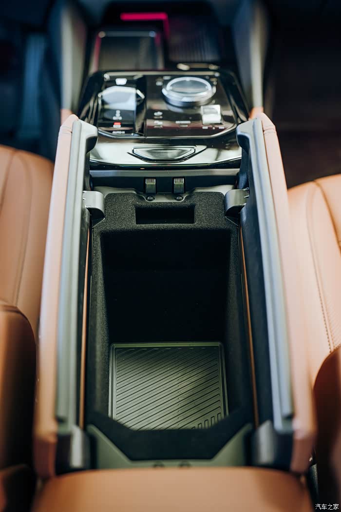中央扶手带有水杯架,也是亮黑色的设计,中间镶嵌了数字5的设计。里面有个跟前排一样的隐藏储物空间