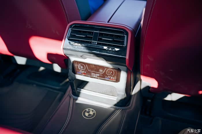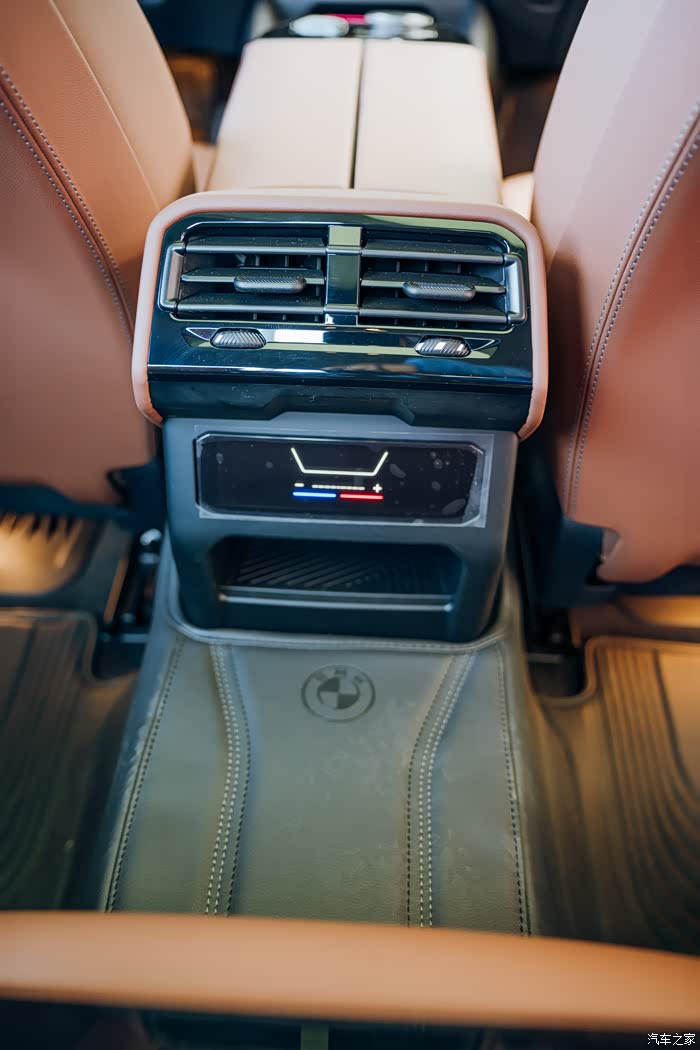 后排中央扶手也带有两个空调出风口,可以手动调风向,温度还能分区控制。下方是个触摸面板,能调风速大小还有个储物空间。