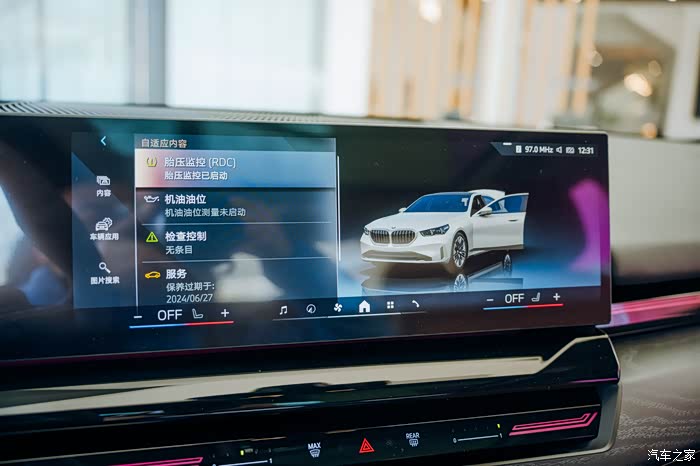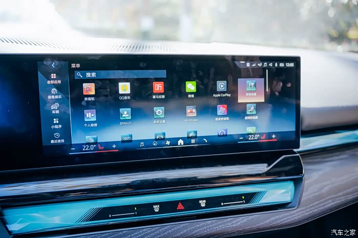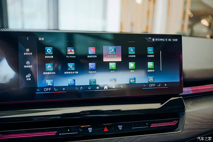车机使用了骁龙8155芯片,带有最新的iDrive 8系统,界面功能丰富。系统设置、温度显示、座椅调节、车辆控制、车辆状态,还有导航、安全气囊、电话连接、网络信息等等。
