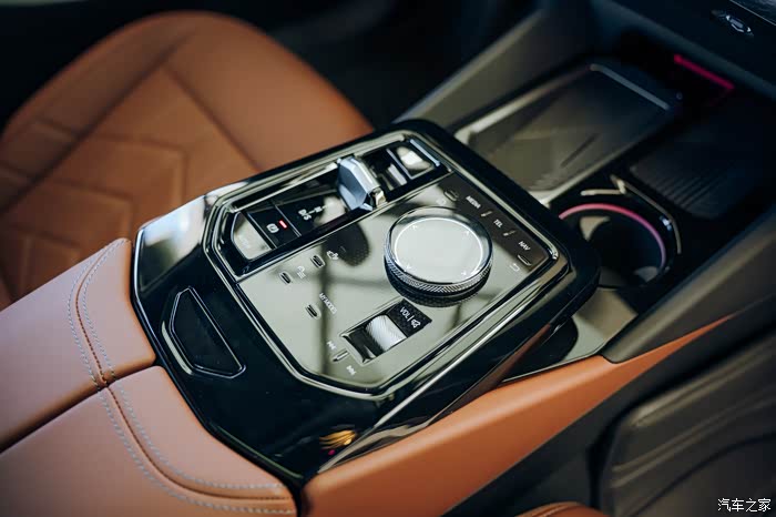 中央扶手后方带有触摸屏,可以操作空调模式,还有一键打开选装的悬浮式大屏幕开关。