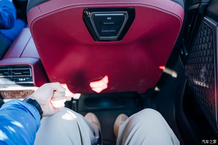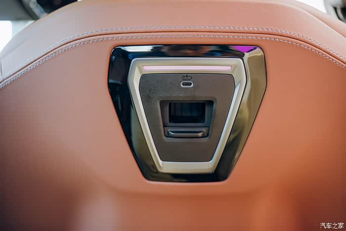 前排座椅后背设置了一个集成装置,有Type-c充电口和屏幕支架,还能放个pad使用