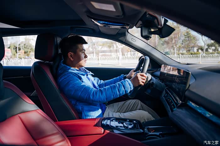 说说驾驶感受吧,这款车开起来挺带感,虽然它是一台5米1多的车,但开起来完全没有大车那种感觉。整体非常扎实,标准模式下,方向盘挺轻的,车头反应和转向也挺好,稍微动一点方向,车身就有反应。换到运动模式,方向盘就变重了,手感更稳。在城市里开也很灵活,在低速的时候,方向盘和油门都特别轻便,在市区拥挤道路上驾驶也没有压力。