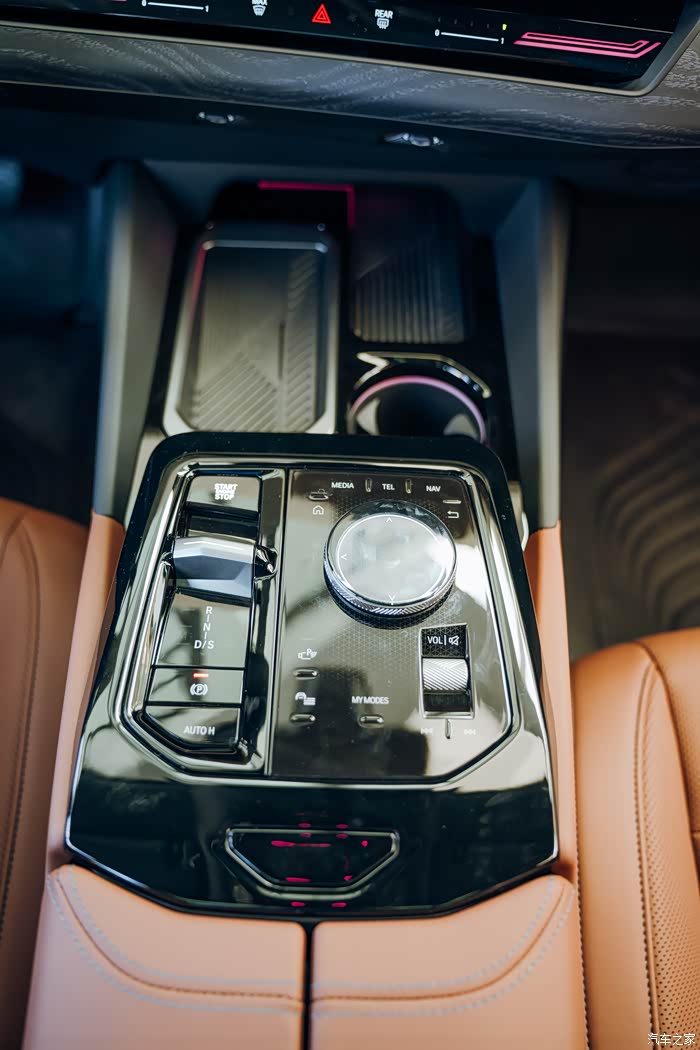 最上方是手机无线充电,左边是一键启动(全系标配),拨片式电子挡杆和面板平齐,不容易误触。下方是电子手刹和驻车P按键功能。右边隐藏式按键有多媒体、电话、地图、返回、主菜单、摄像头、驾驶模式、驾驶辅助设置、音量调节(上滑+ 下滑- 按下静音),中间旋钮为人机交互 控制旋钮。