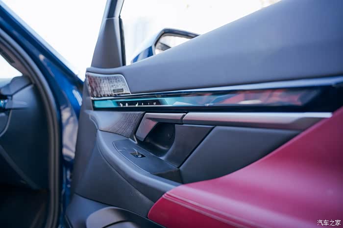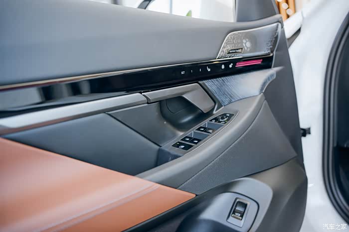 车门上的喇叭下面有一排触摸按键,这样设计方便操作不需要低头弯腰那种,使用黑色亮条装饰,黑色显的就有豪华感觉。下面是开门拉手,旁边是控制车窗升降、后视镜折叠和调节。在车门上用了好几种颜色和材质。