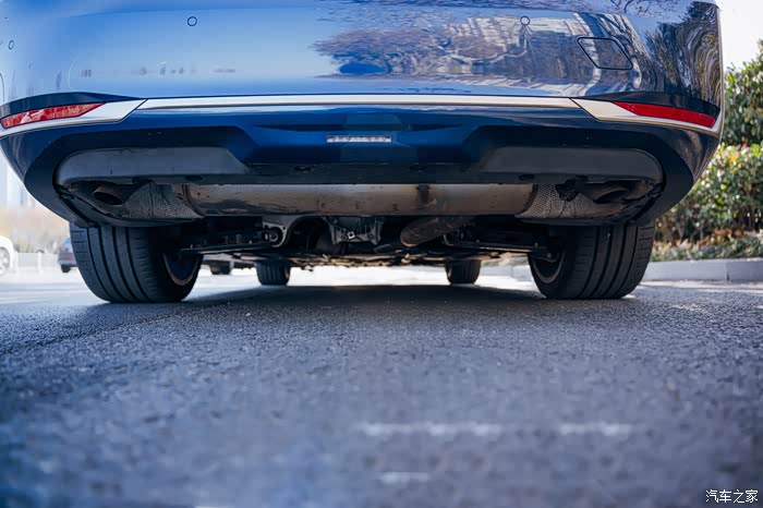 车尾明显能看到使用双边单出的排气装饰,尾部造型看起来简洁大气,也有不少层次感。尾灯形状扁扁的,车牌那设计得也挺有心思,凹进去一点,让车尾看起来更有立体感。车尾下面还加了一条贯穿的镀铬条,两边还有雾灯。