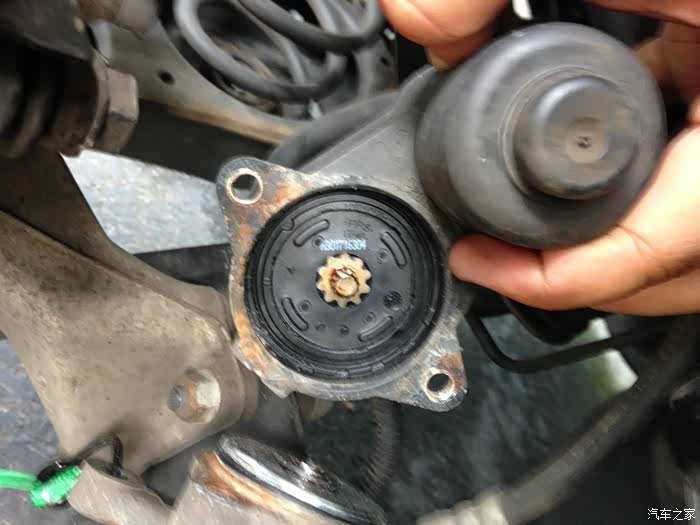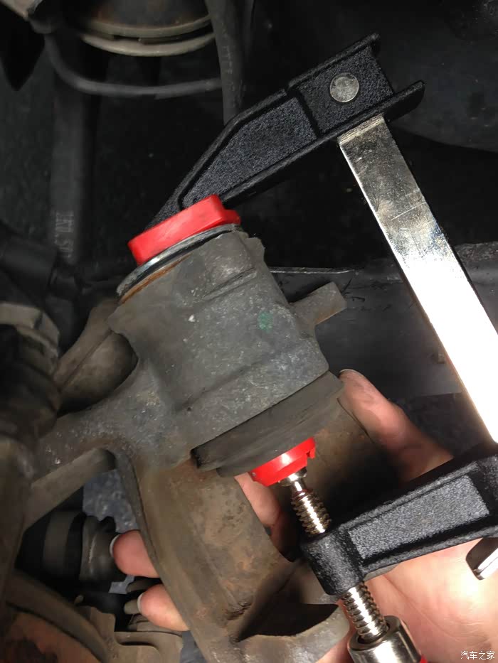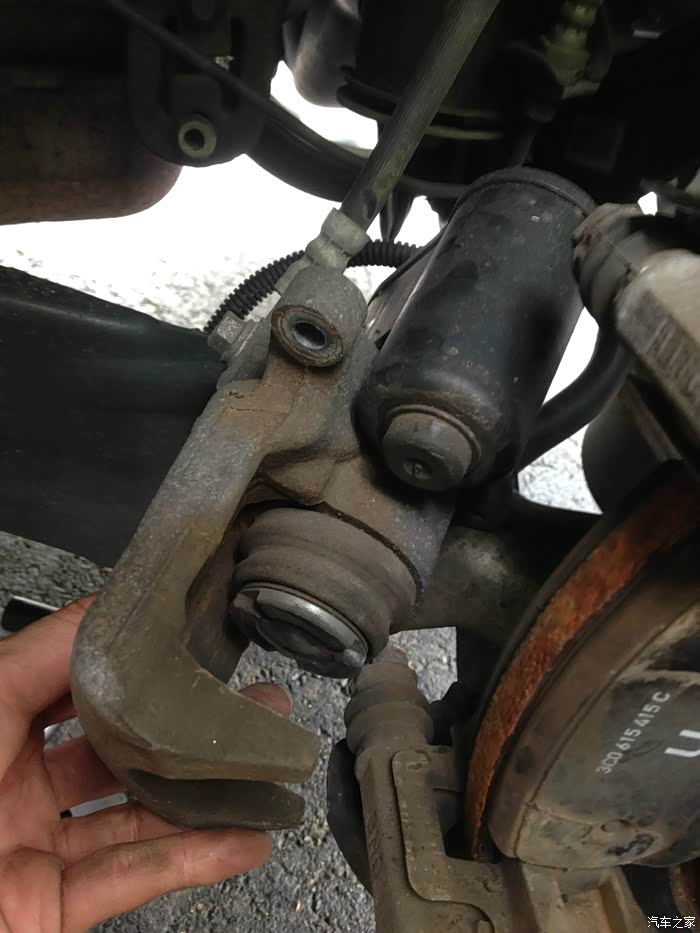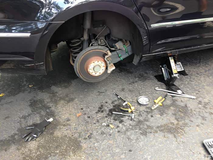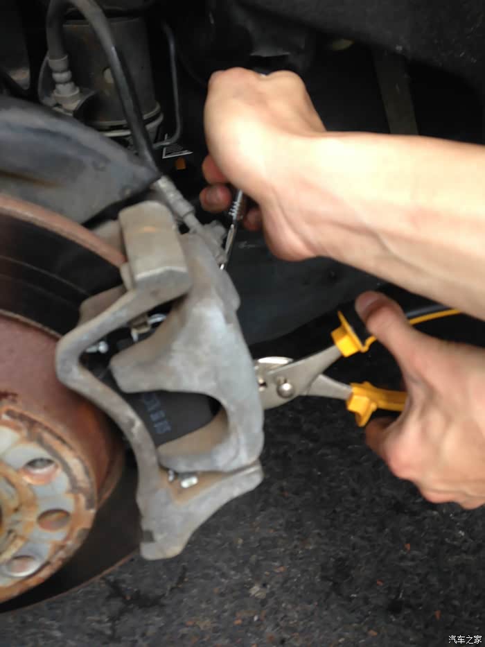 我决定帮他一下,我们自己搞。我之前已经帮好几辆车换过刹车了,而且都是盘和片一起换的,不过那些都是日本车。我还没搞过大众这种“高级”车,对于这种“高级”车,摆在面前的一道主要障碍是CC的电子手刹,这玩意用起来倒是方便,修起来就费事了,因为换刹车片需要推回卡钳活塞,而这个电子手刹就挡在这里,没法把活塞推回去。官方的做法是,要用OBD接口连接汽车诊断电脑,用电脑操纵电子手刹退回去,之后才能推回活塞。要买这大众专用的诊断电脑,便宜的也得百八十美元,贵的几百美元,要买个电脑就跟去dealer换没啥区别了。我就上YouTube搜索,果然找到了手动撤回电子手刹的方法,简单地说就是卸开电子手刹电极很卡钳活塞的连接处,把里面的螺丝手动拧回去,就可以了。具体的过程我会在贴子照片里描述。