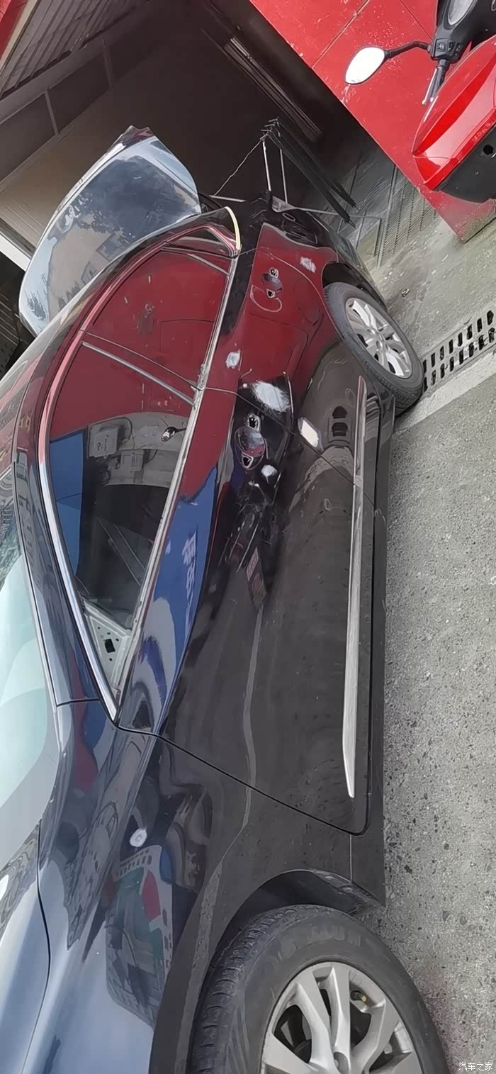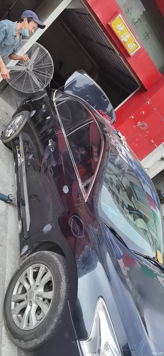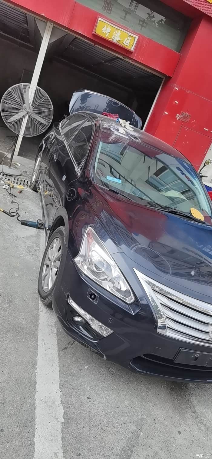 原车全黑 也不是黑 阳光下泛幽兰 说不出啥色 停在一个广告安装喷漆的旁边 全身飞漆 多处划伤 小印子