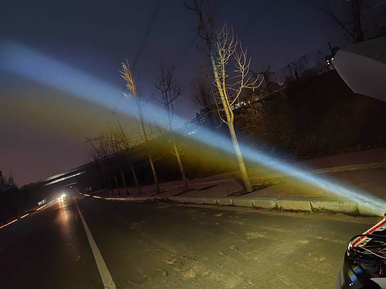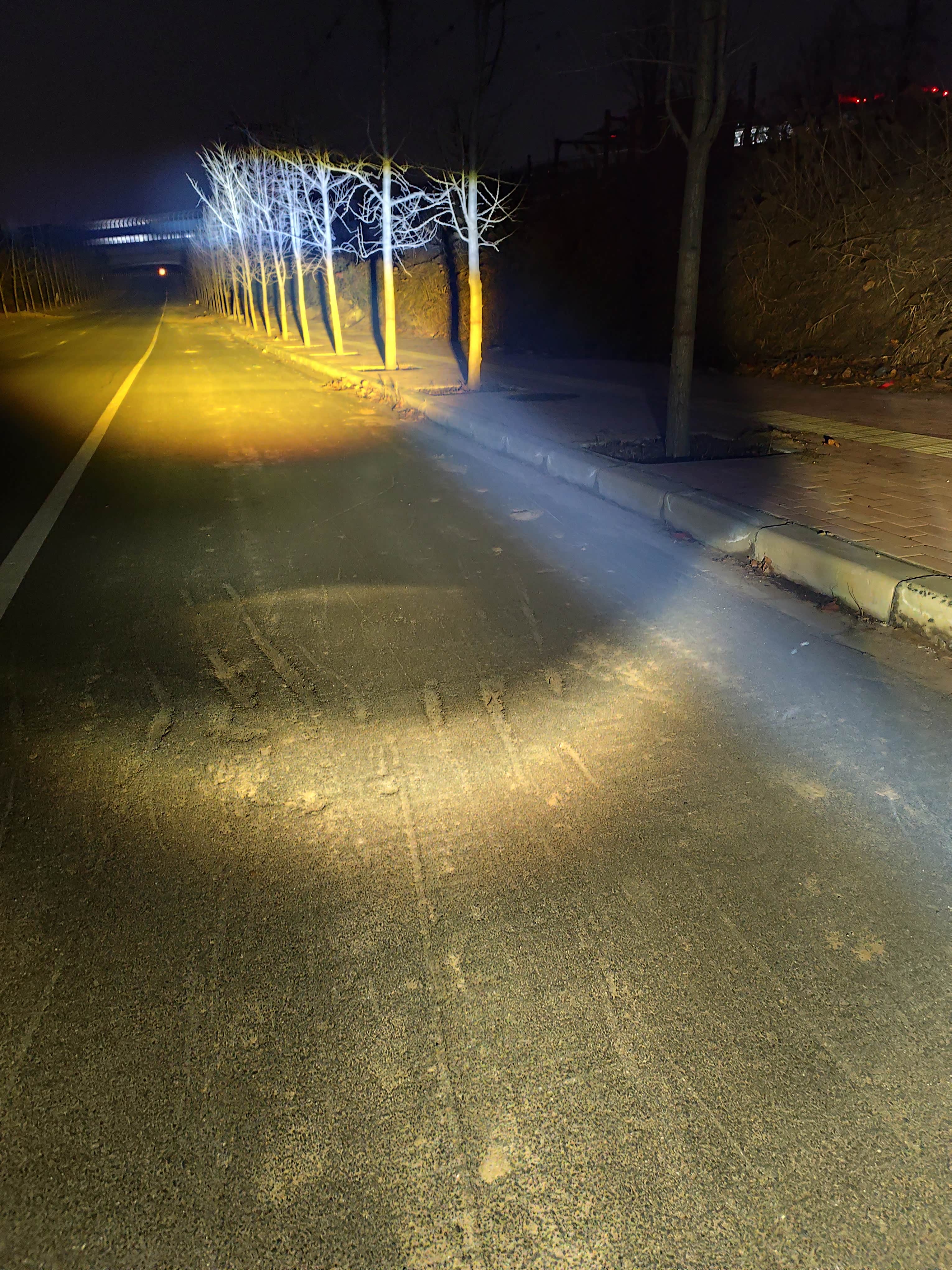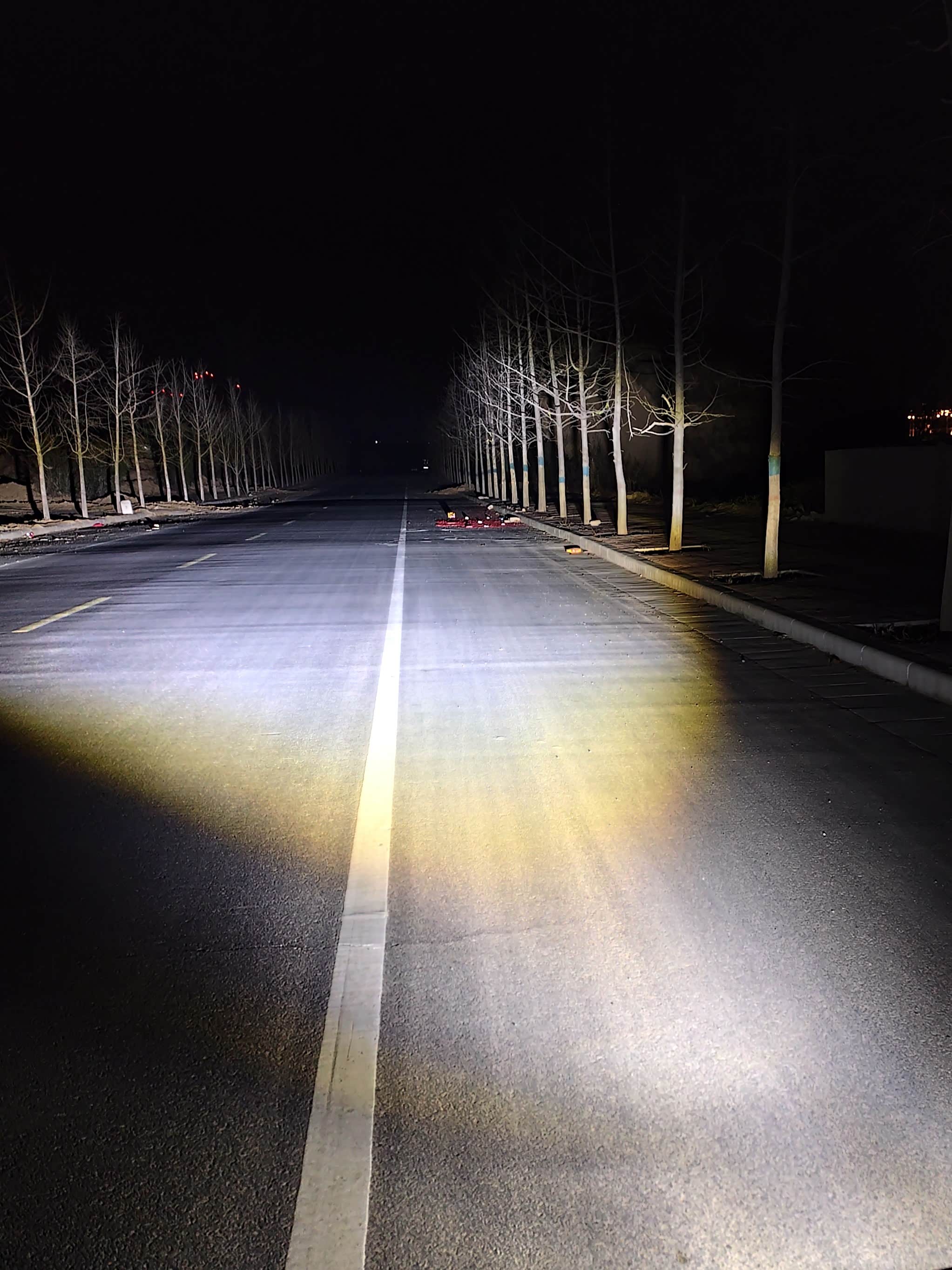 郊区无照明道路:开启原车远光灯+射灯组合后,整个视野焕然一新。原本昏暗的前方道路被均匀照亮,路面细节清晰可见,照射距离从原来的80米左右扩展到近150米。
