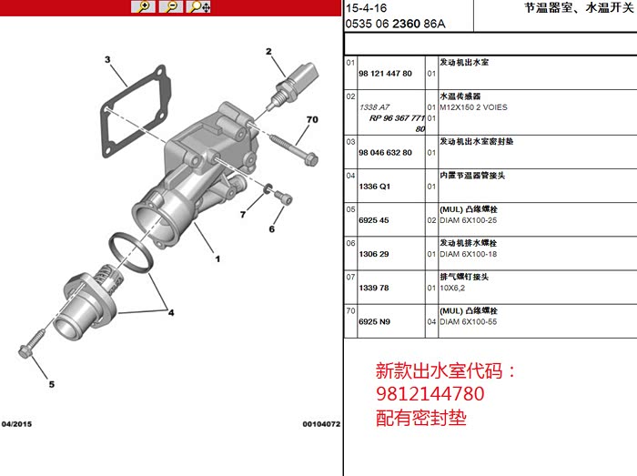施工过程拍的照片很少,其实很简单,出水室一共四颗M10的固定螺丝,扭矩大概在8Nm~10Nm,拆之前要排出防冻液、松掉空滤支撑座、节温器水管、水温传感器插头等等。