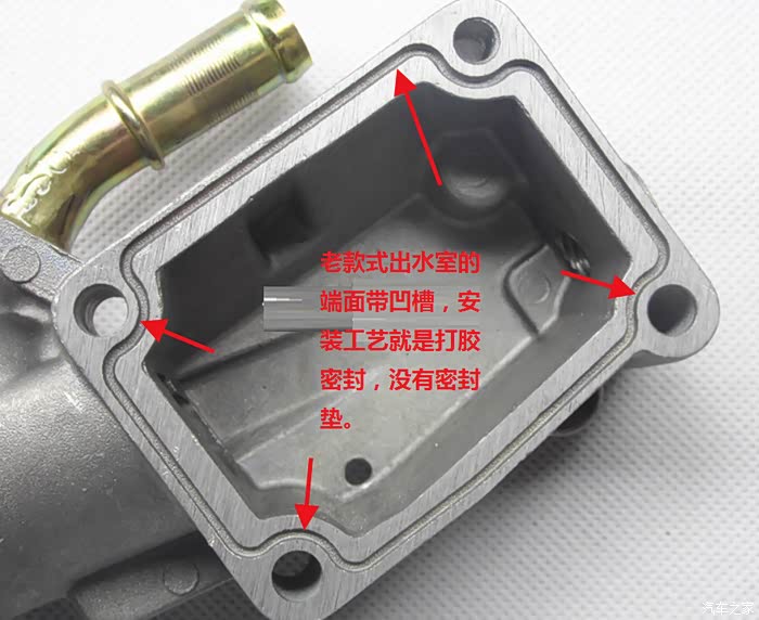 上个帖子说到出水室漏液的问题,其实这几年,ec5、ec8发动机的出水室密封形式,厂家已经做了改进,老款车型(比如我的13款)出水室和缸体之间的密封形式就是打胶(出水室端面带凹槽),新款是采用密封垫形式(出水室端面不带凹槽)