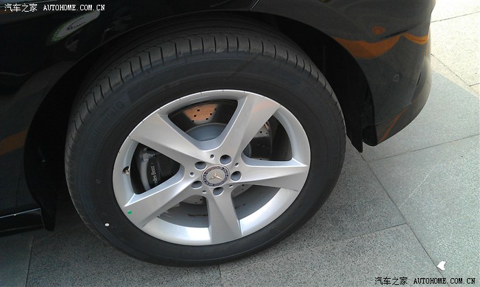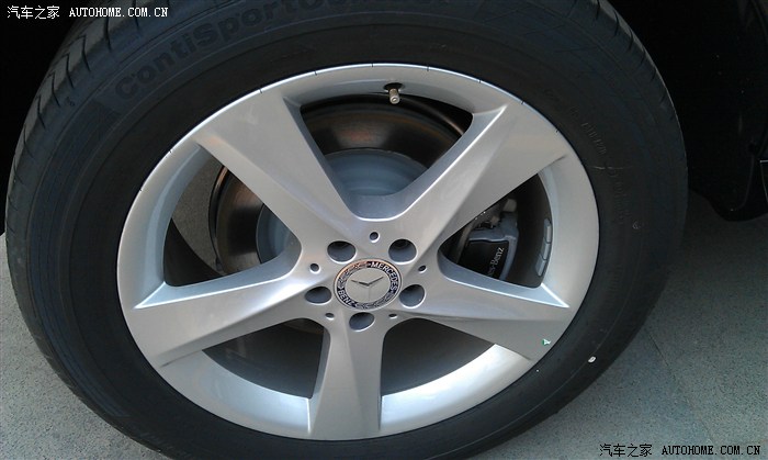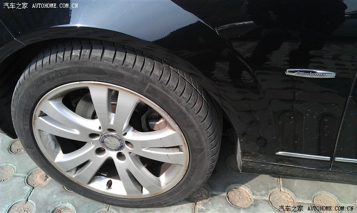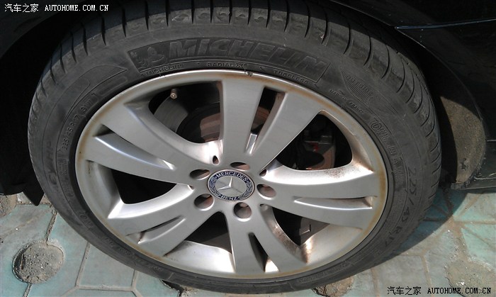 轮胎照片,奔驰不厚道,只有前面是打孔刹车盘,后边是普通的不打孔刹车,,
