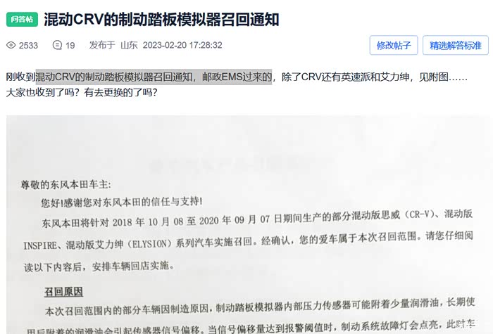 2月份时收到了东本EMS来的混动CRV制动踏板模拟器召回通知,随后在论坛发了个帖子咨询大家。 前些天 本地的4S又电话通知到店检测,于是趁周末去了。先接电脑检测什么5项参数指标,很快便有结果确认需要更换,当时检修师傅说从3月31号开始陆续检测了140多辆车,真需要换的就5、6辆,我这运气也真是好了