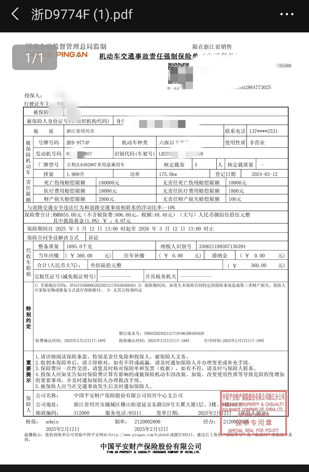 交强险保费合计:1215元